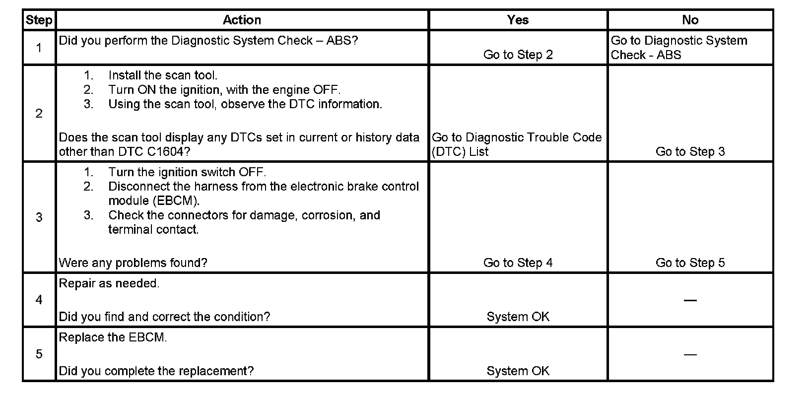^ If the conditions that set DTC C1604 are no longer present, the DTC may be cleared by using the proper scan tool.