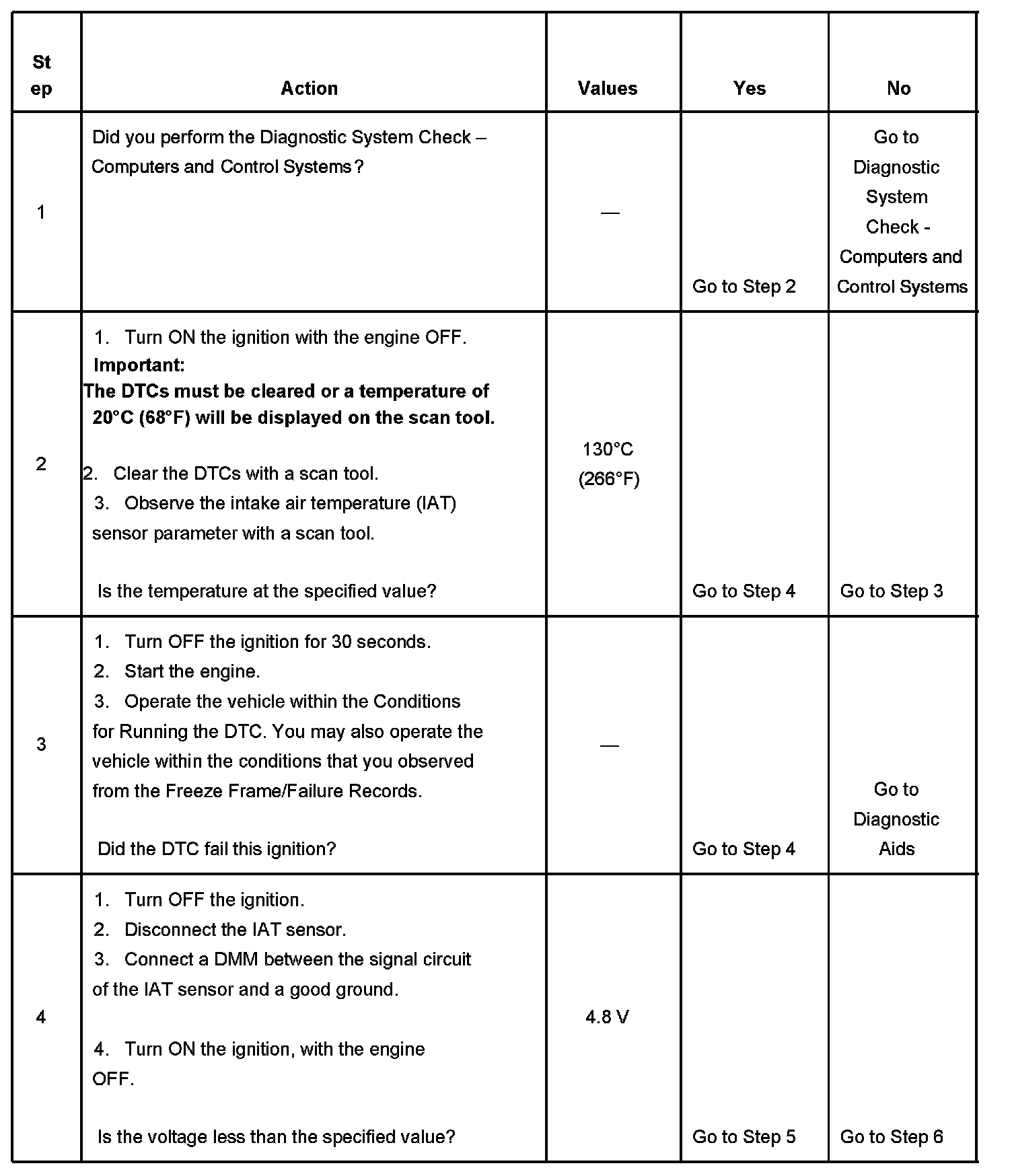 The intake air temperature (IAT) sensor is a variable resistor that measures the temperature of the air entering the engine. The IAT sensor has a signal circuit and a low reference circuit. The engine control module (ECM) supplies 5 voltsto the IAT signal circuit and a ground for the IAT low reference circuit. If the ECM detects an excessively low IAT signal voltage, which is a high temperature indication, this DTC sets.