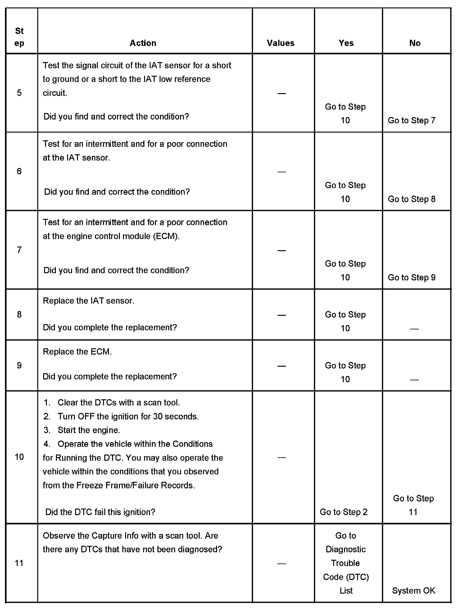 - A high resistance on either the IAT sensor signal circuit or the IAT sensor low reference circuit may not set a DTC.