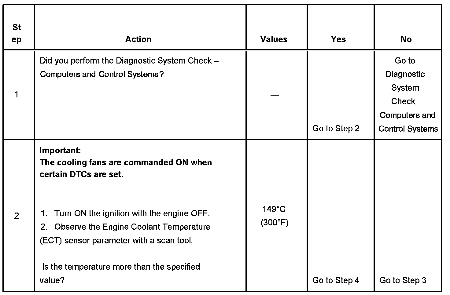 The ECM detects that the ECT sensor is more than 149°C (300°F) for more than 4 seconds.