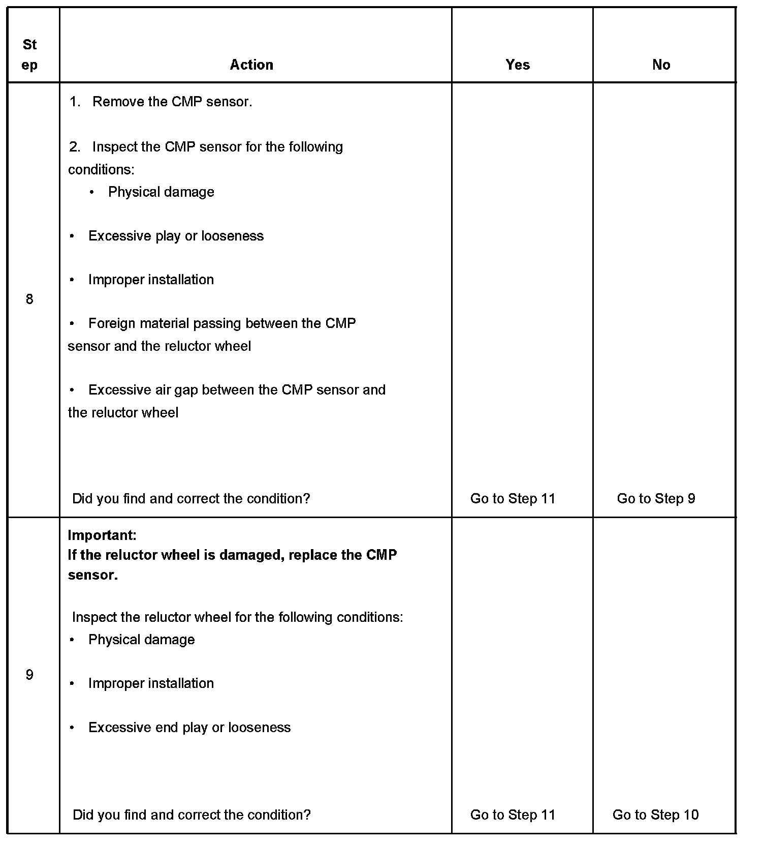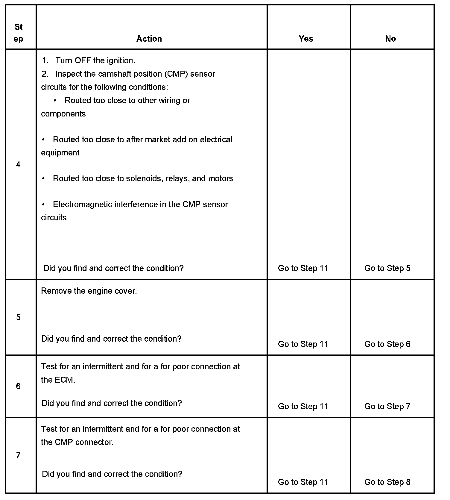 The camshaft position (CMP) sensor correlates the crankshaft to camshaft position so that the engine control module (ECM) can determine which cylinder is ready to be fueled by an injector. As the camshaft rotates, the reluctor wheel interrupts a magnetic field produced by a magnet within the sensor and sends a signal to the ECM through the signal circuit. The CMP sensor circuits are directly connected to the ECM. The CMP sensor also determines which cylinder is misfiring. The circuits between the CMP sensor and the ECM consists of the following: