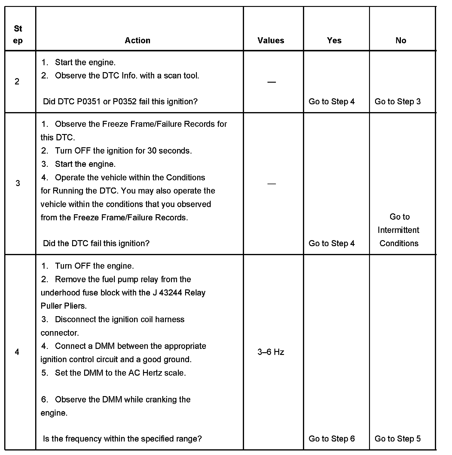 4. This step tests the ignition coil. If the frequency is within the specified range, there is a condition with the ignition control circuit or the ECM.