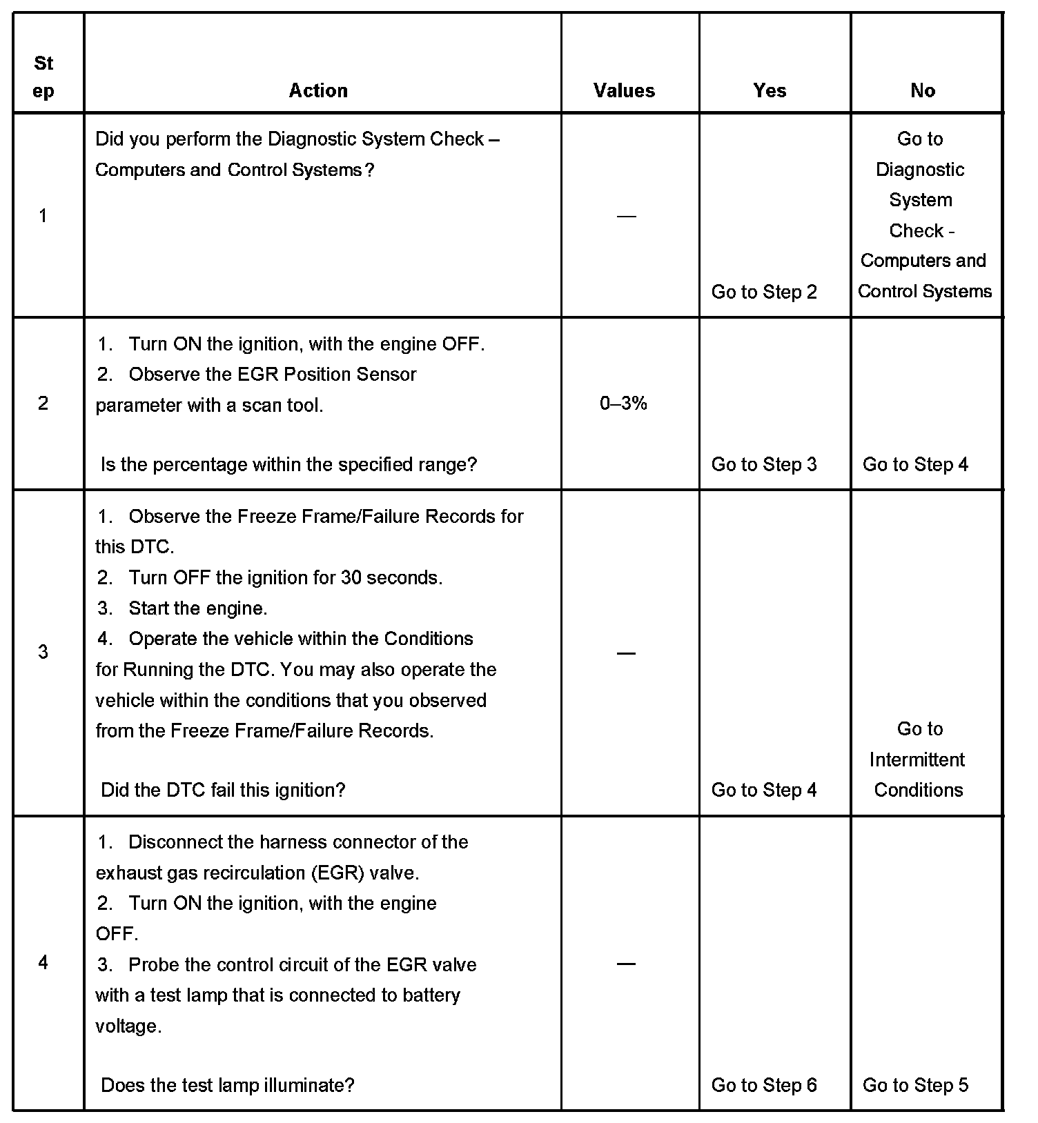 The ECM detects excessive EGR flow due to the EGR valve pintle being open more than 70 percent for 3 seconds during crank.