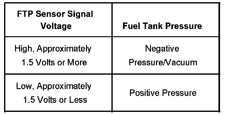 The table illustrates the relationship between FTP sensor signal voltage and the EVAP system pressure/vacuum.