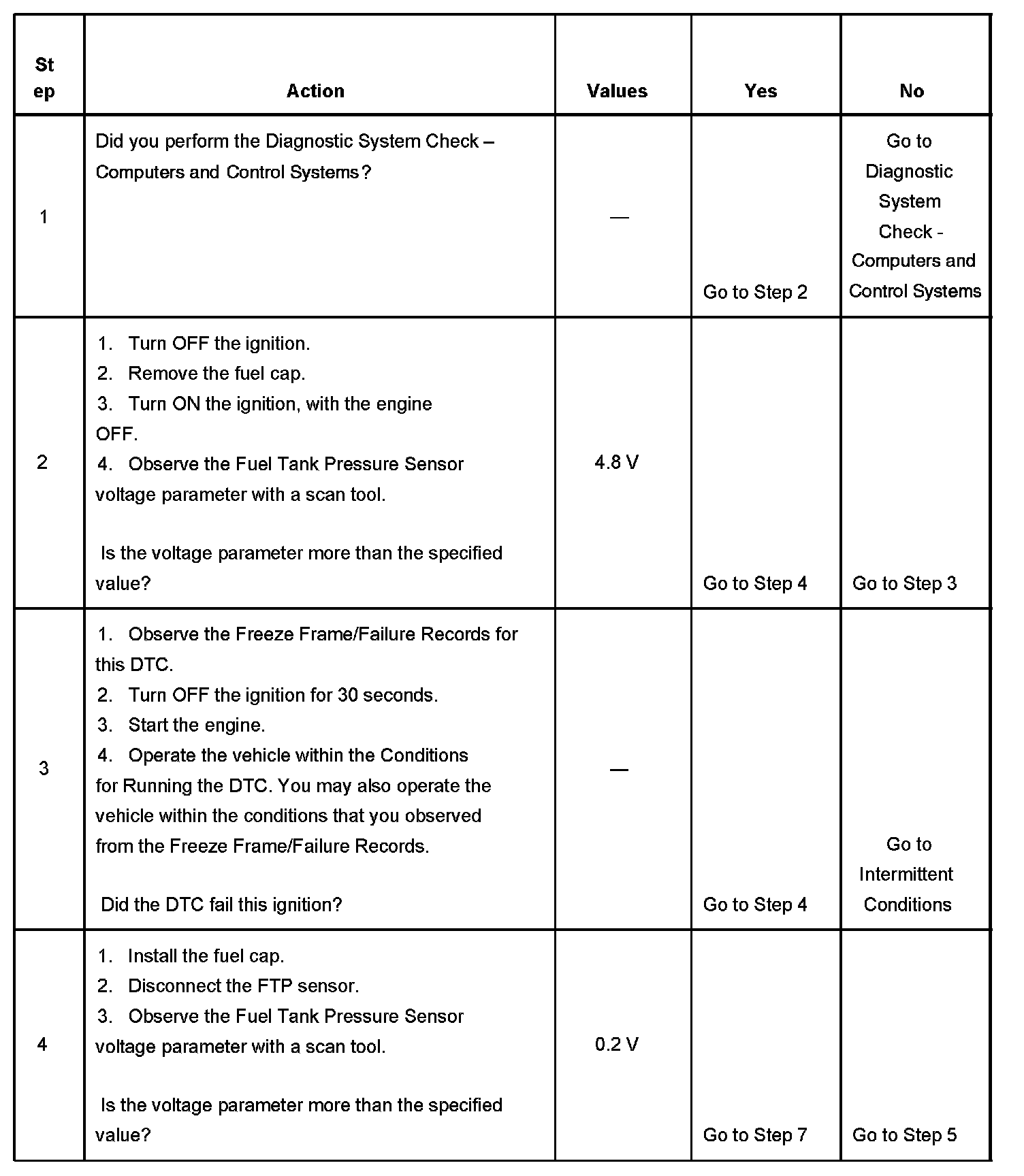 The evaporative emission (EVAP) system is used to store fuel vapors in order to reduce the amount of fuel vapors into the atmosphere. The fuel tank pressure (FTP) sensor is only used for EVAP system diagnostics. The FTP sensor is a transducer that varies resistance according to changes in the fuel tank pressure. The engine control module (ECM) monitors the FTP sensor signal in order to detect vacuum decay and excess vacuum during the EVAP system diagnostic test. The ECM supplies a 5-volt reference and a low reference circuit to the FTP sensor. If the ECM detects that the FTP sensor signal voltage is too high, this DTC sets.