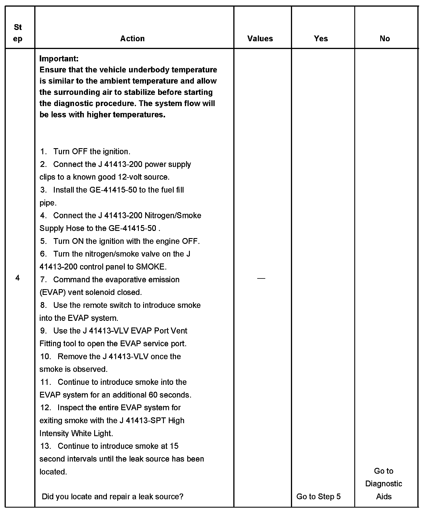 To help locate intermittent leaks, use the J 41413-200 Evaporative Emissions System Tester (EEST) to introduce smoke into the EVAP system. Move all EVAP components while observing smoke with the J 41413-SPT High Intensity White Light. Introducing smoke in 15 second intervals will allow less pressure into the EVAP system. When the system is less pressurized, the smoke will sometimes escape in a more condensed manner.