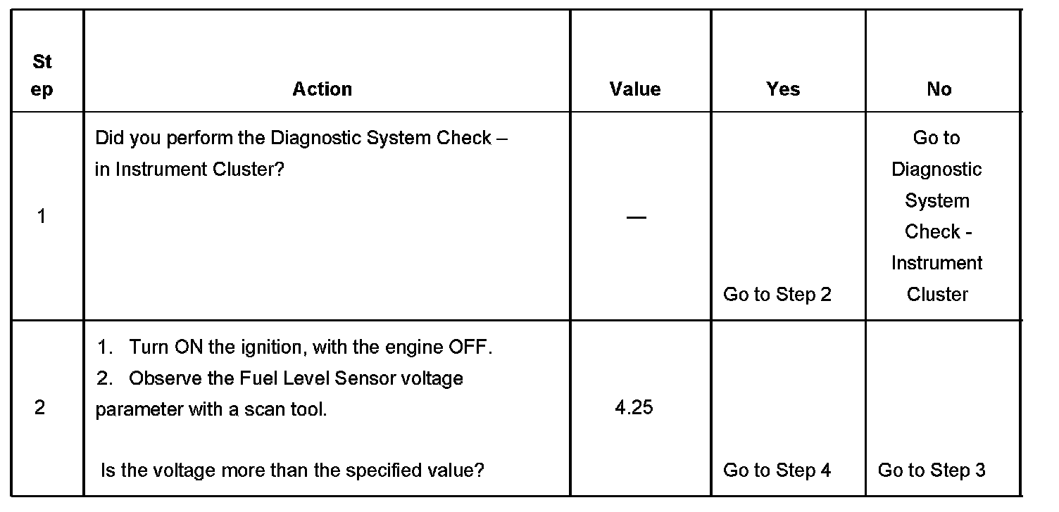 - The ECM detects that fuel level signal voltage is less than 0.25 volts.