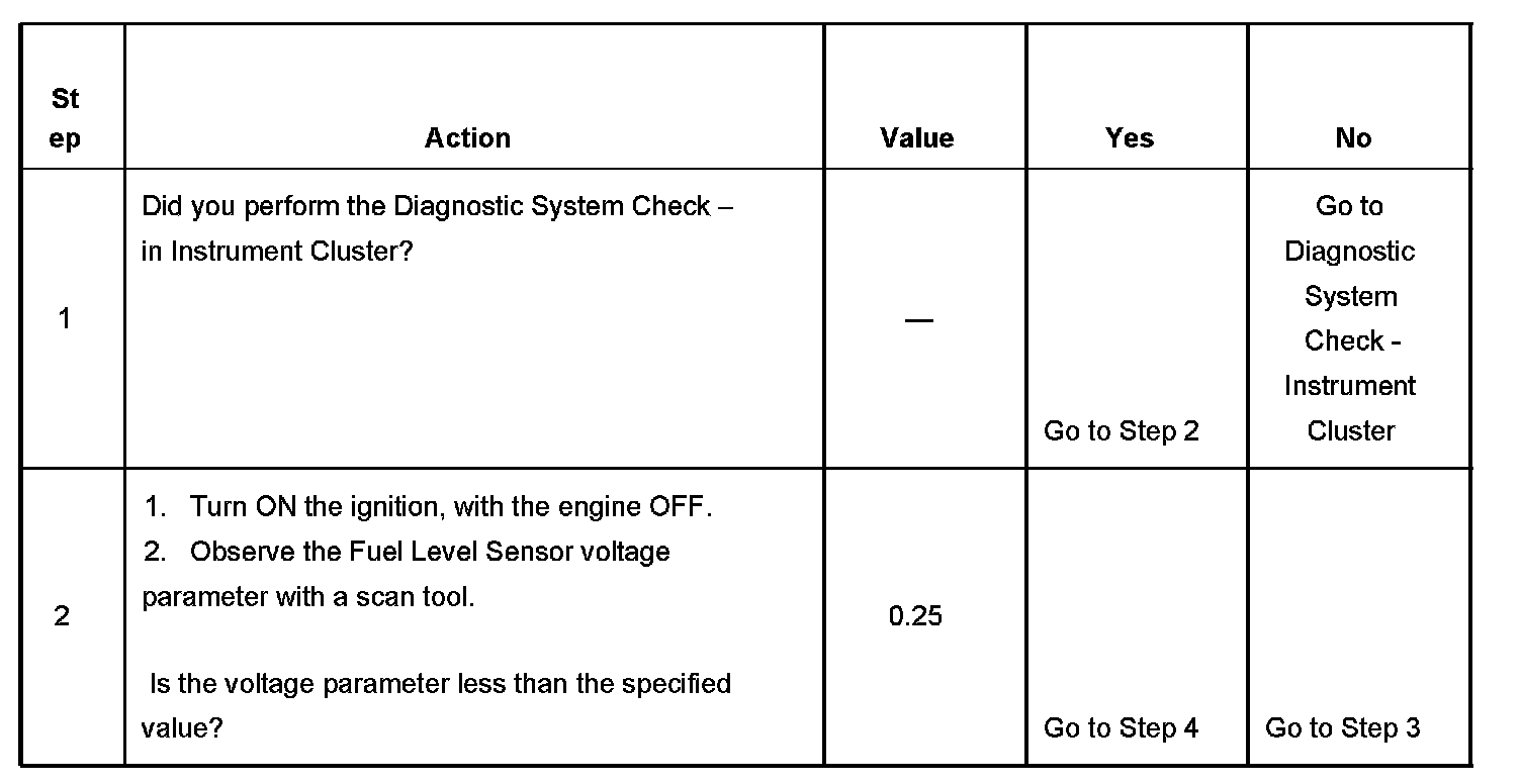- The fuel level signal voltage is more than 4.25 volts.