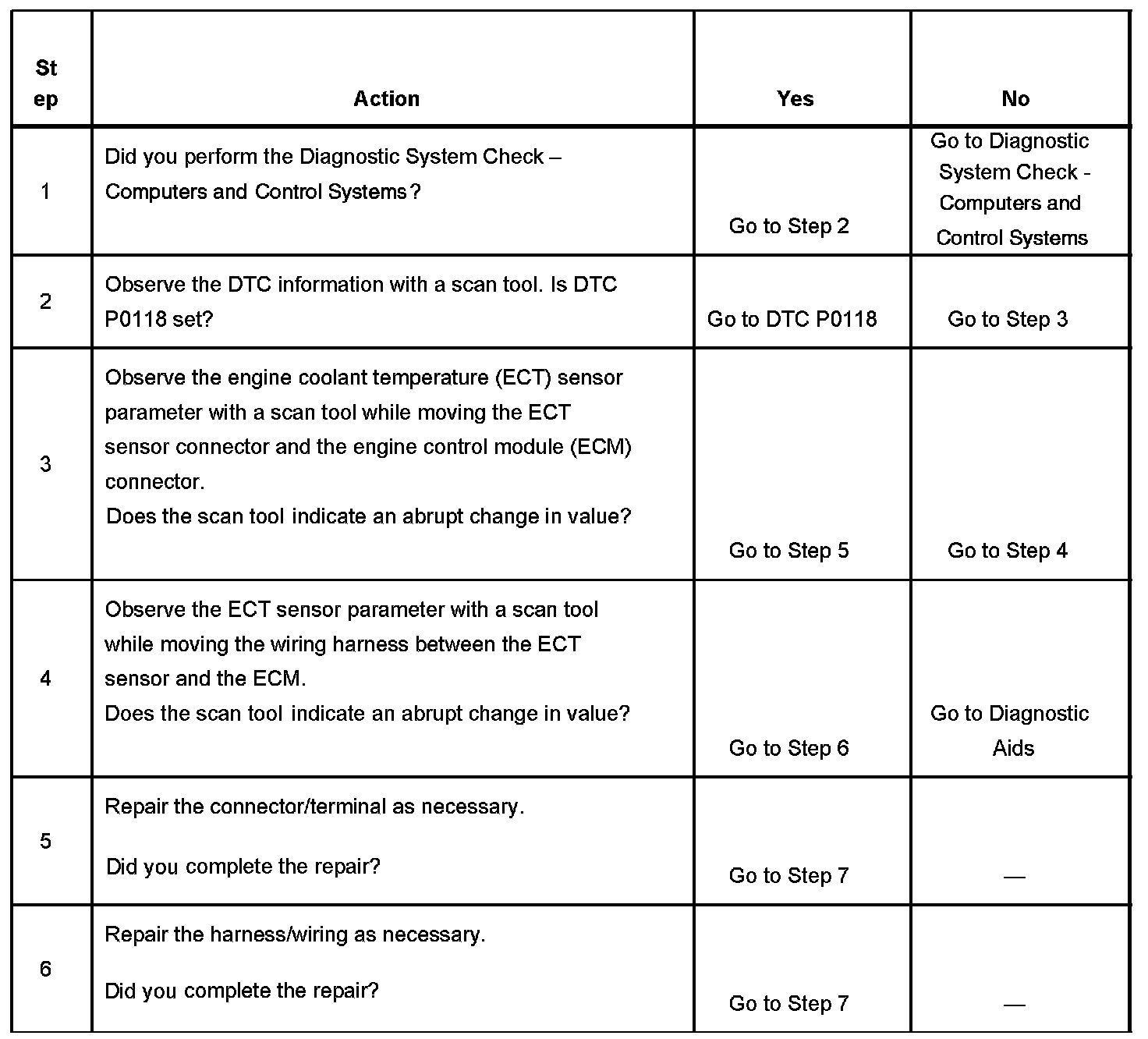 The engine coolant temperature (ECT) sensor is a variable resistor that measures the temperature of the engine coolant. The engine control module (ECM) supplies 5 volts to the ECT signal circuit and supplies a ground to the low reference circuit. If the ECM detects an intermittent high ECT signal voltage, which is a low temperature indication, this DTC sets.