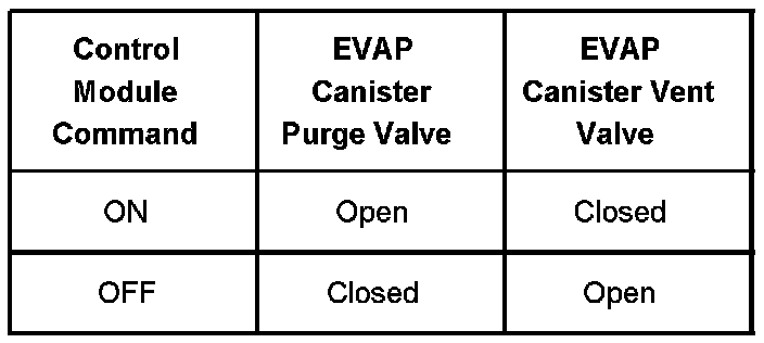 The table illustrates the relationship between the ON and OFF states, and the OPEN or CLOSED states of the EVAP canister purge and vent valves.
