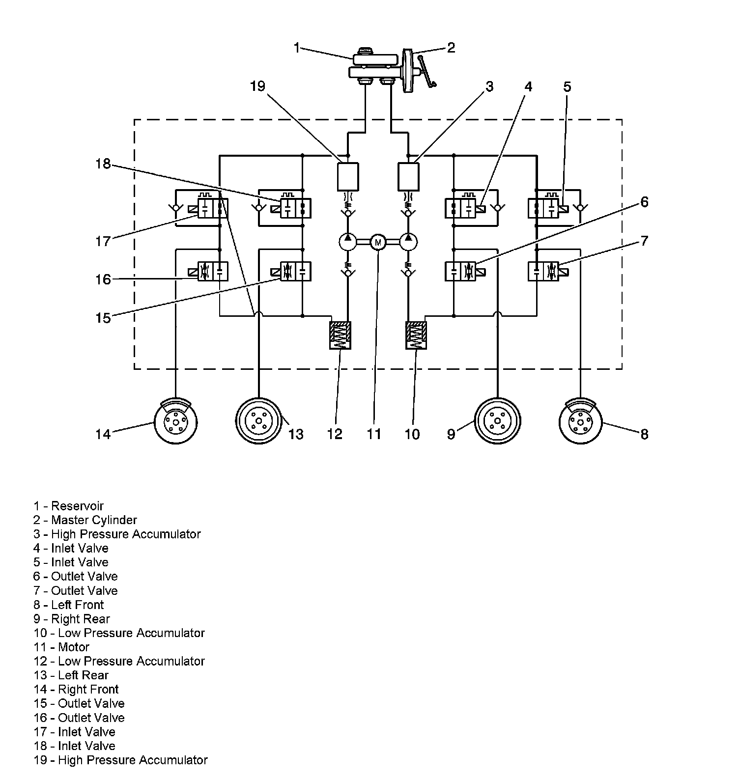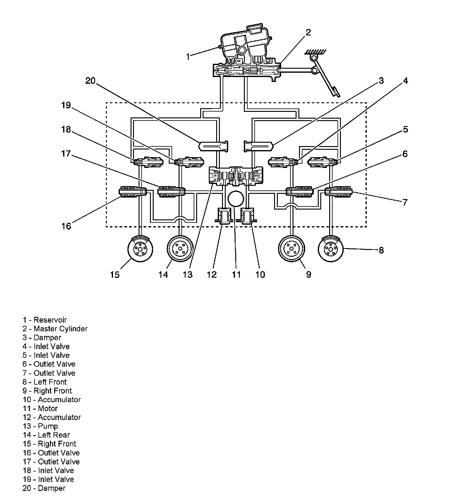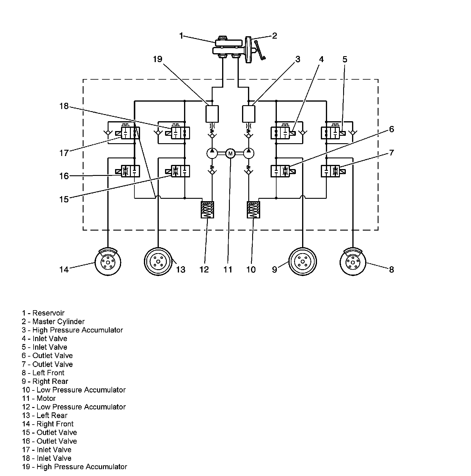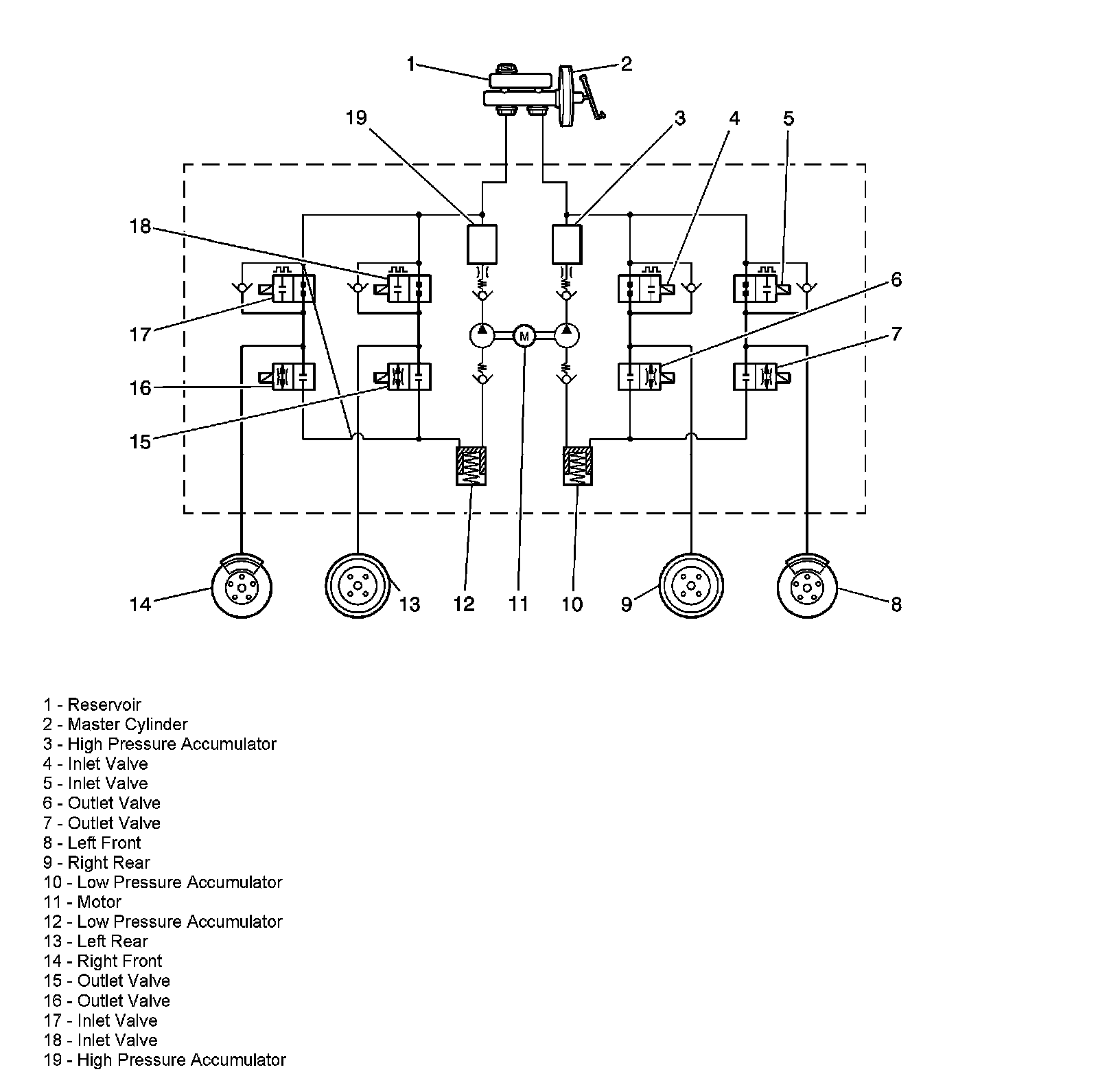 The base-line braking mode of the ABS modulator used in this vehicle is a diagonal split system. In this system, 1 master cylinder circuit supplies pressure to the right front and the left rear brakes. The other circuit supplies pressure to the left front and the right rear brakes. All valves in the hydraulic modulator are in their normal, non-energized positions as shown in the drawings found in the hydraulic diagram.