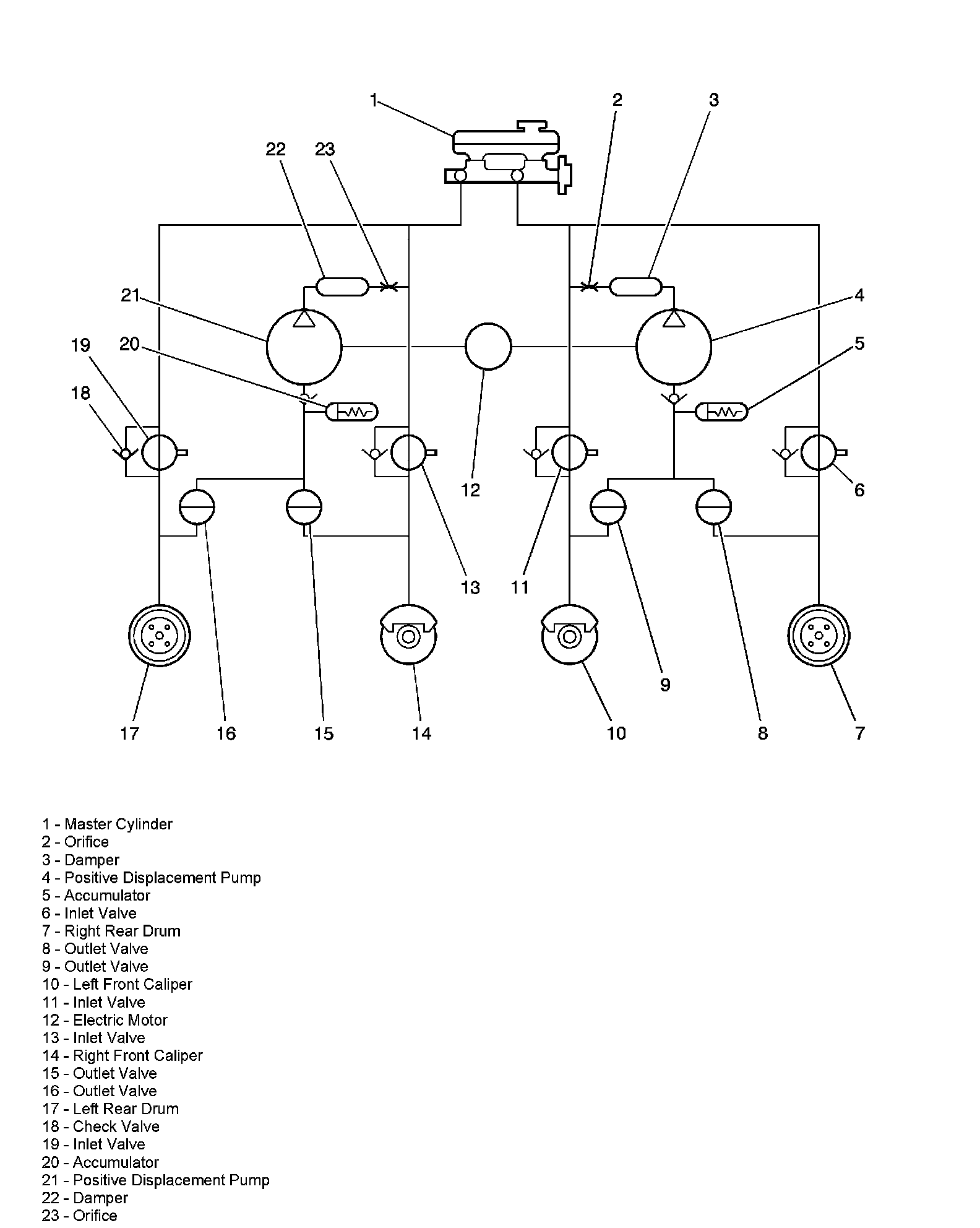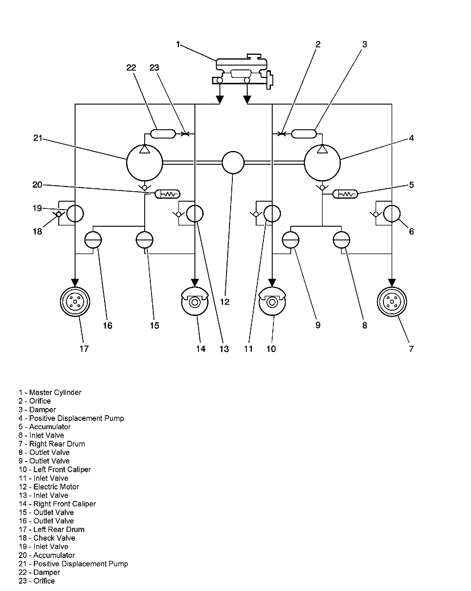 The basic hydraulic unit configuration consists of the hydraulic check valves, 2 solenoid valves for each wheel, a hydraulic pump, 2 accumulators, and 2 dampers (Delphi system only). The hydraulic unit controls the hydraulic pressure to the front calipers and the rear wheel cylinders by modulating hydraulic pressure to prevent wheel lockup.
