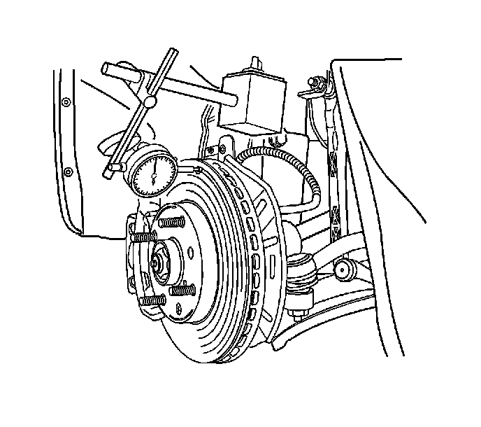 1. Install the dial indicator to the vehicle. Position the indicator button in the brake rotor friction surface area 10 mm (0.39 inch) from the outer edge of the brake rotor.