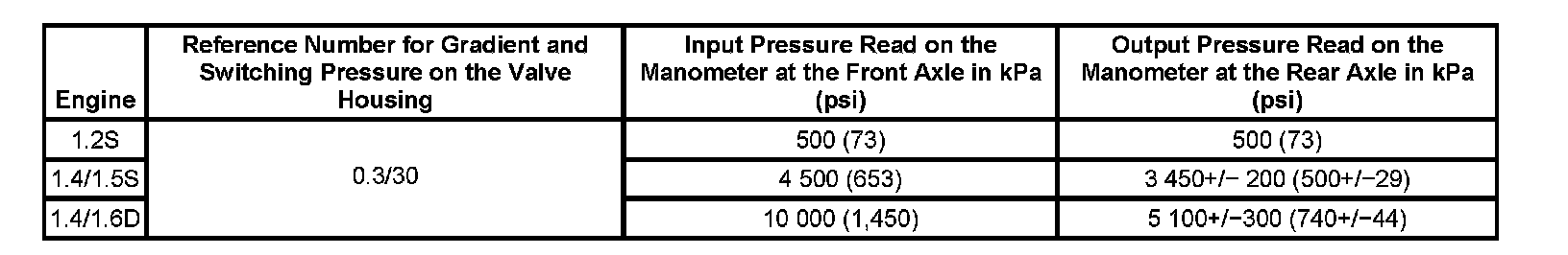 Build pressure until the test values in the following proportioning valve test chart are achieved.