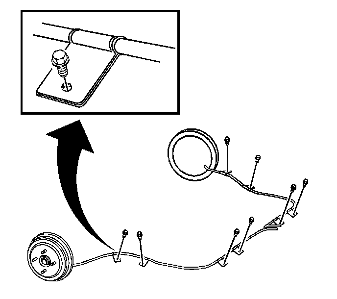5. Install the parking brake cable to the underbody side brackets on each side of the vehicle, and a bracket near the underbody side bracket.