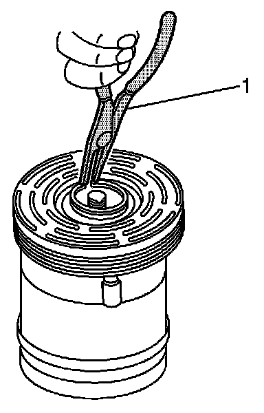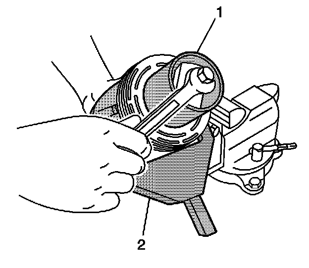 6. Install the J 33020 (1) into the inner circle of slots in the pulley rotor. Turn the J 33020 (1) clockwise in the slots to engage the puller tangs with the segments between the slots in the rotor.