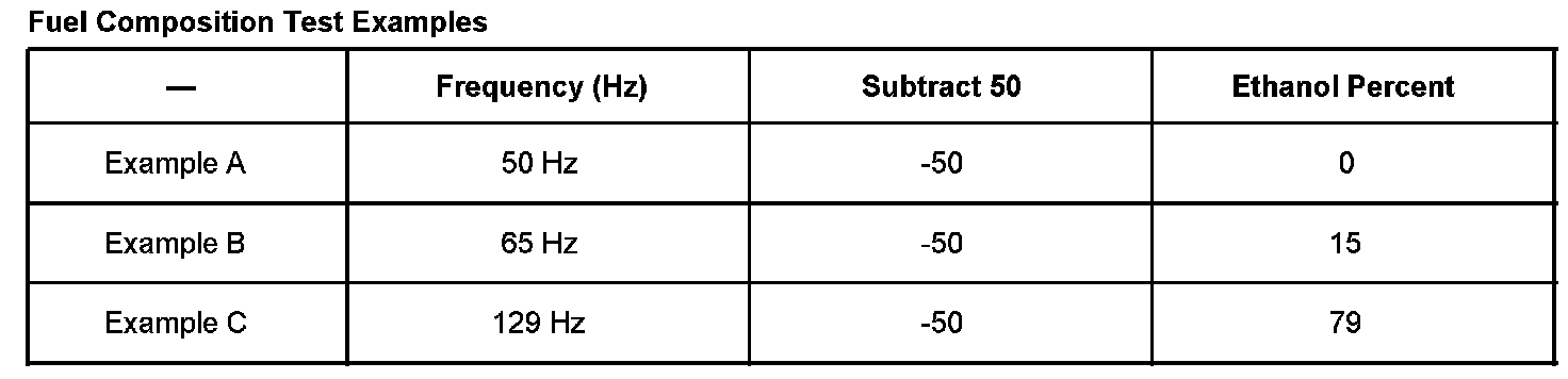 3. Subtract 50 from the reading on the DMM in order to obtain the percentage of alcohol in the fuel sample. Refer to the examples in the Fuel Composition Test Examples table.