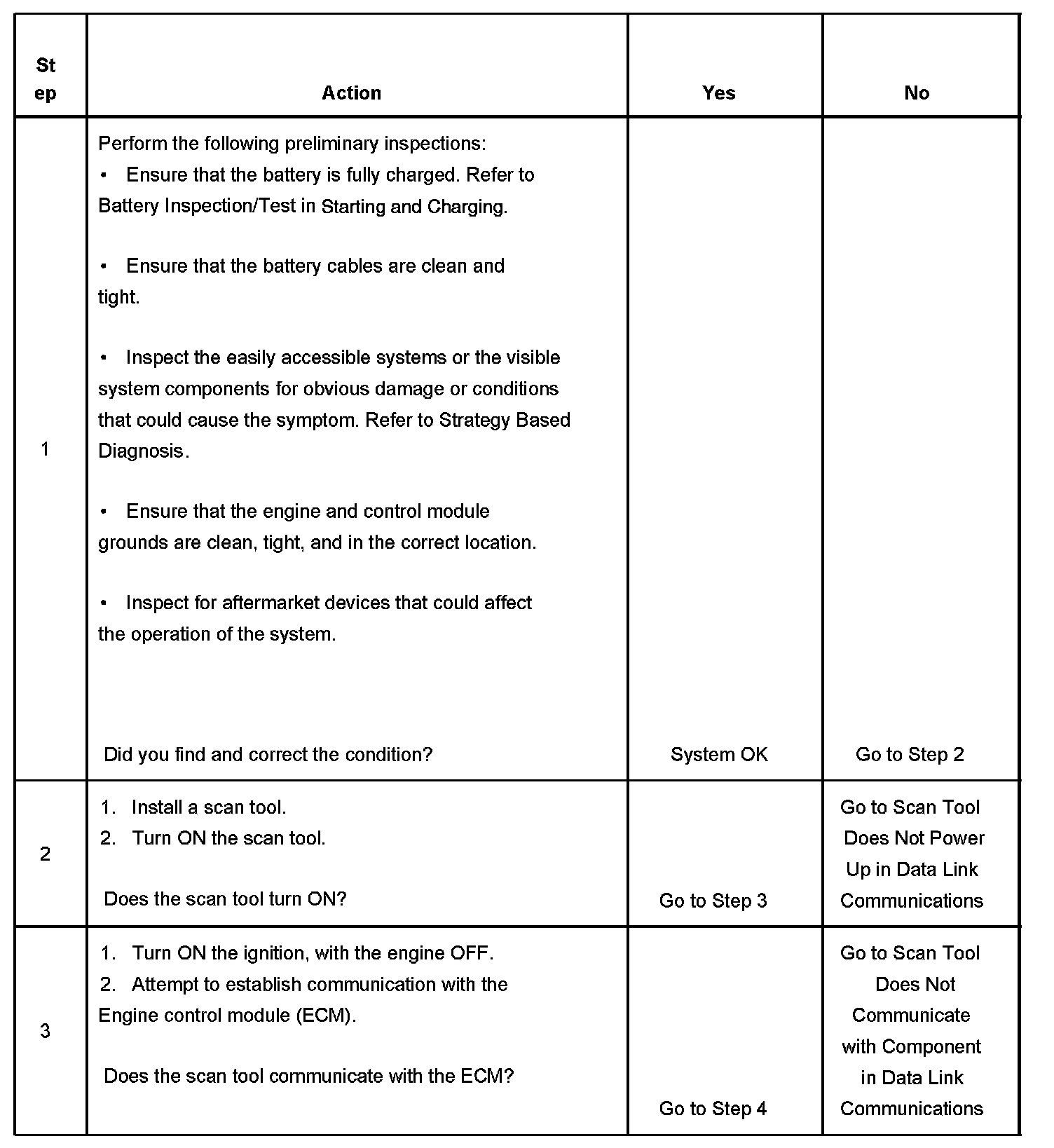 The Diagnostic System Check-Computers and Control Systems is an organized approach to identifying a condition that is created by a malfunction in the engine control system. The Diagnostic System Check must be the starting point for any driveability concern. The Diagnostic System Check directs the service technician to the next logical step in order to diagnose the concern. Understanding and correctly using the diagnostic table reduces diagnostic time and prevents the replacement of good parts.