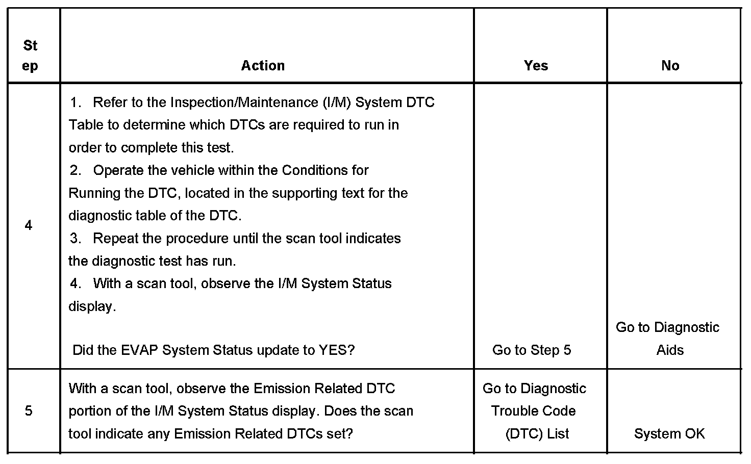 3. This step is to identify a first failure of a type B DTC. A DTC only appears on the I/M System Status display when it becomes a MIL illuminating DTC. This occurs on the second failure of a type B DTC. A first failure of a type B DTC will not allow the I/M System Status to update to YES. Refer to Diagnostic Aids.