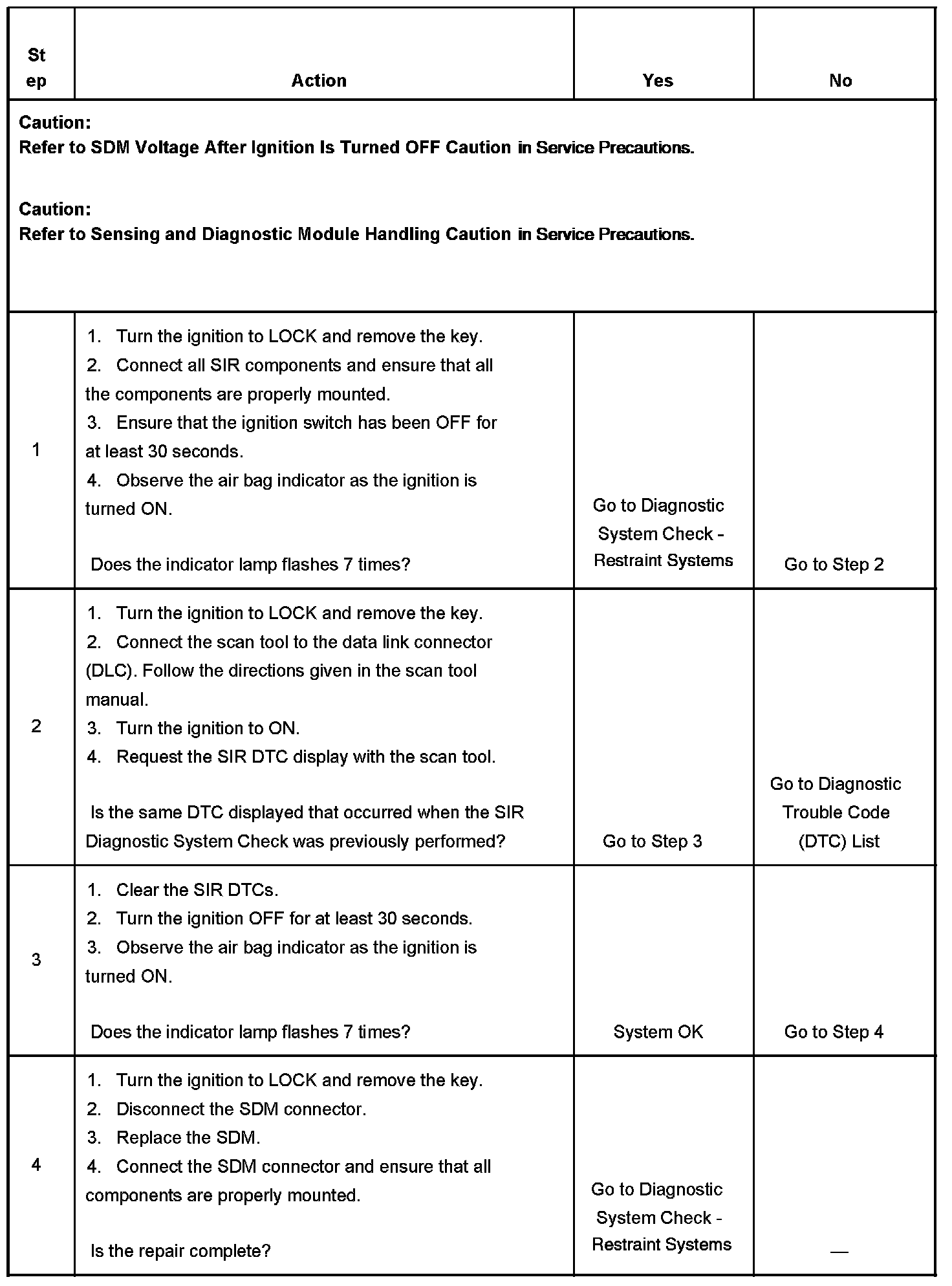 SDM INTEGRITY CHECKThe diagnostic chart must be used when all circuitry outside the sensing and diagnostic module (SDM) has been found to operate properly, as indicated by following the appropriate diagnostic trouble code (DTC) chart. The chart verifies the need for SDM replacement.