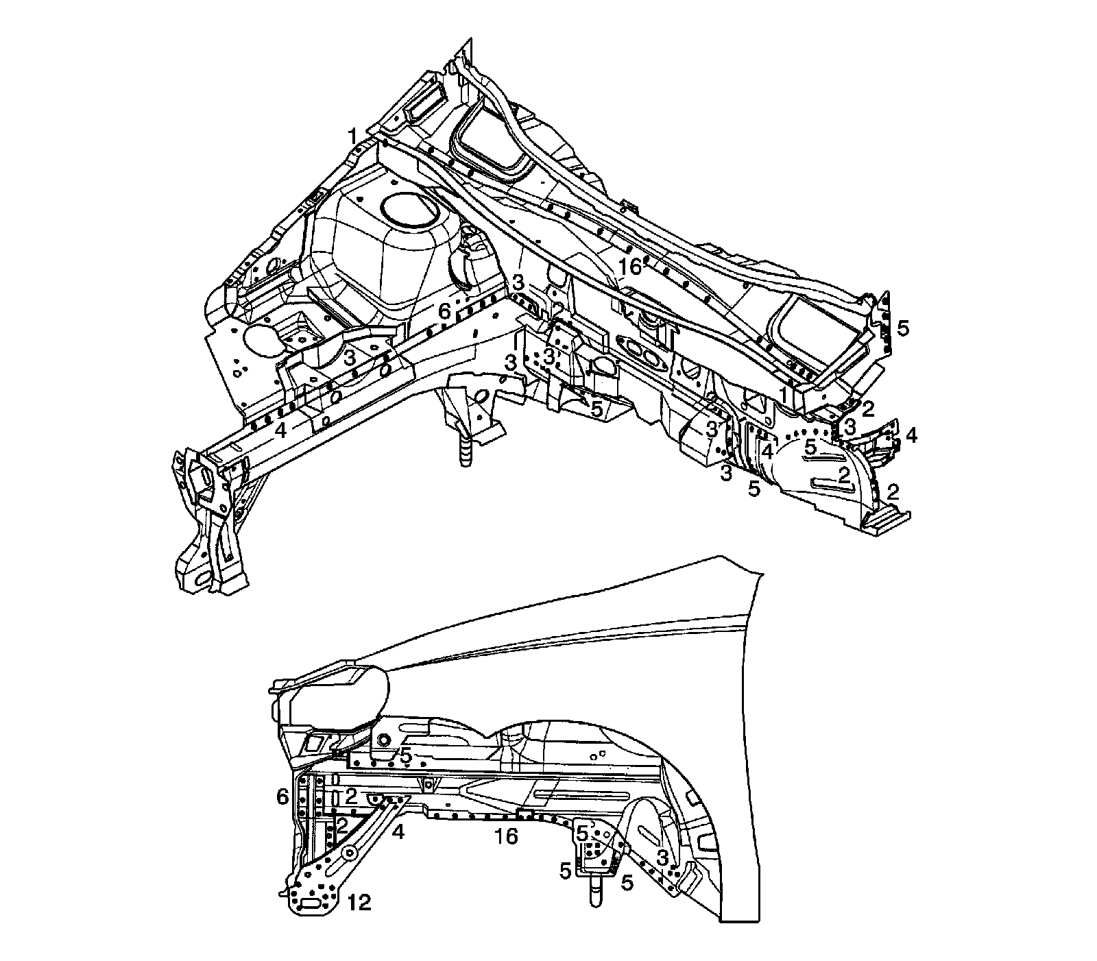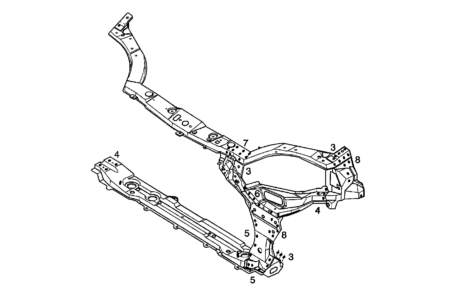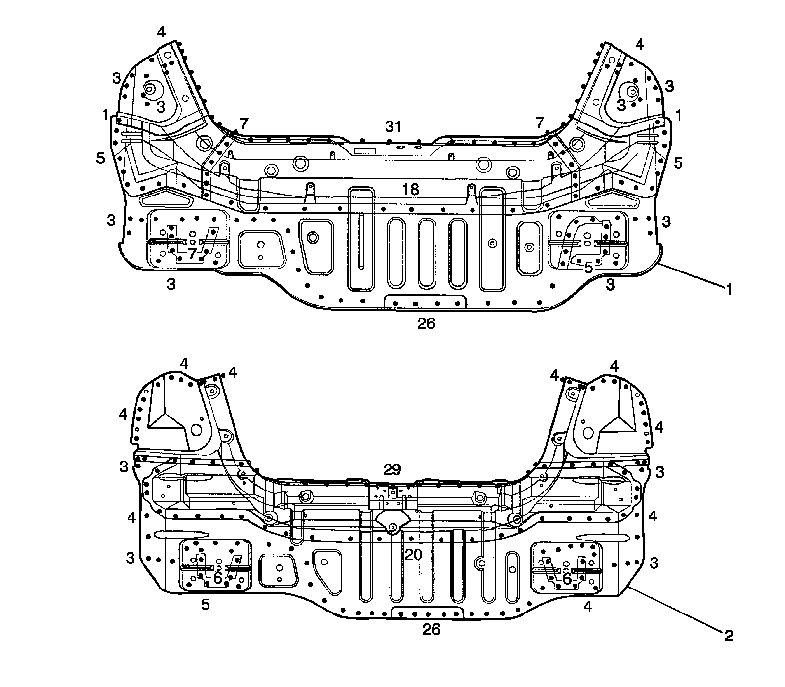 The front panel is joined to the front wheelhouse and front longitudinal. It forms the base for the headlamps and other parts and maintains the rigidity of the front section of the body. Pay particular attention to twists and parallelism and check mounting of related parts when welding.