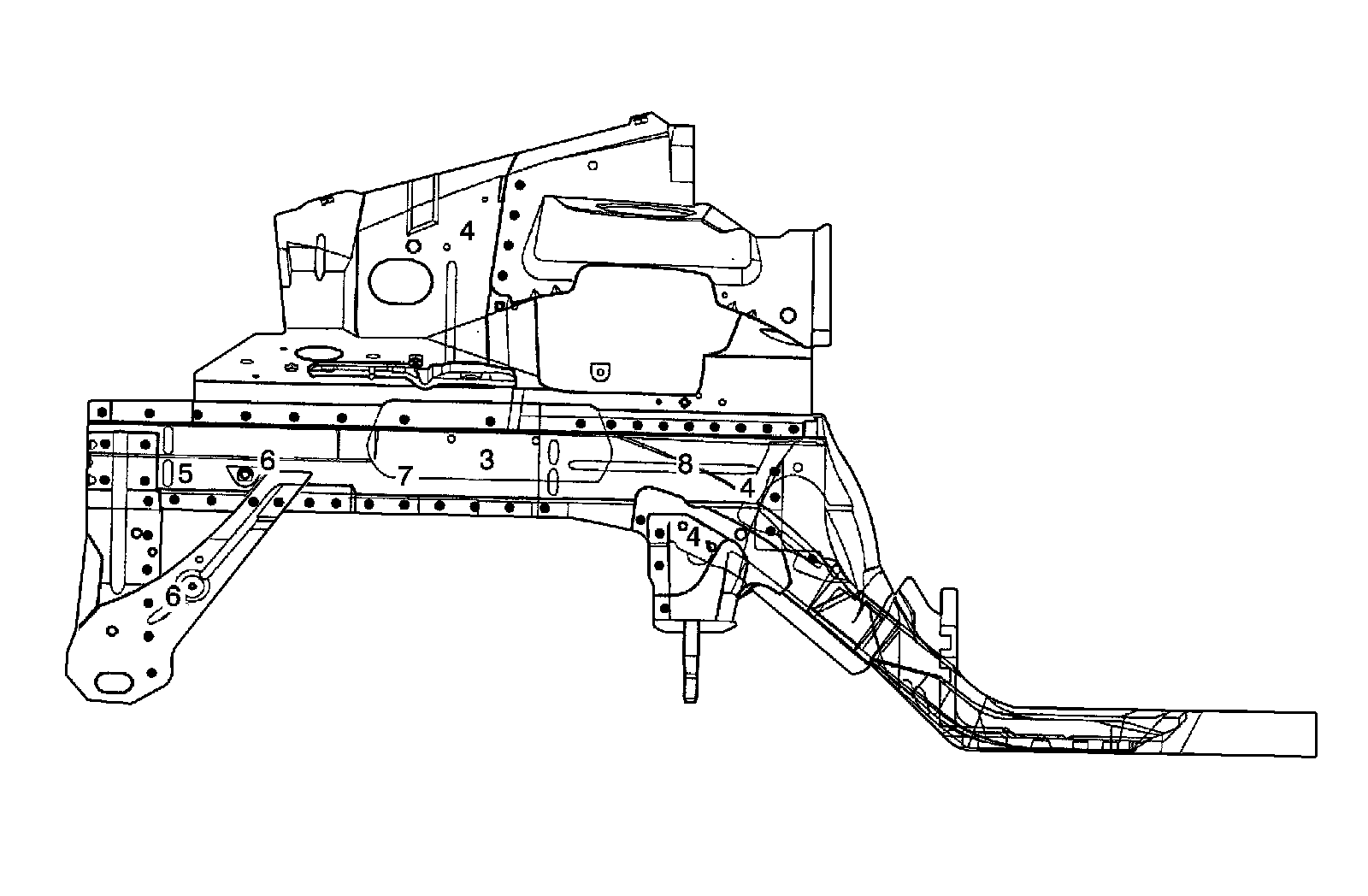 The support control arm is joined to the front longitudinal and crossmember dash lower center. It forms the base for the front suspension and is maintains the rigidity of the front parts. Pay particular attention to the position and dimensions of the weld joints and weld carefully.