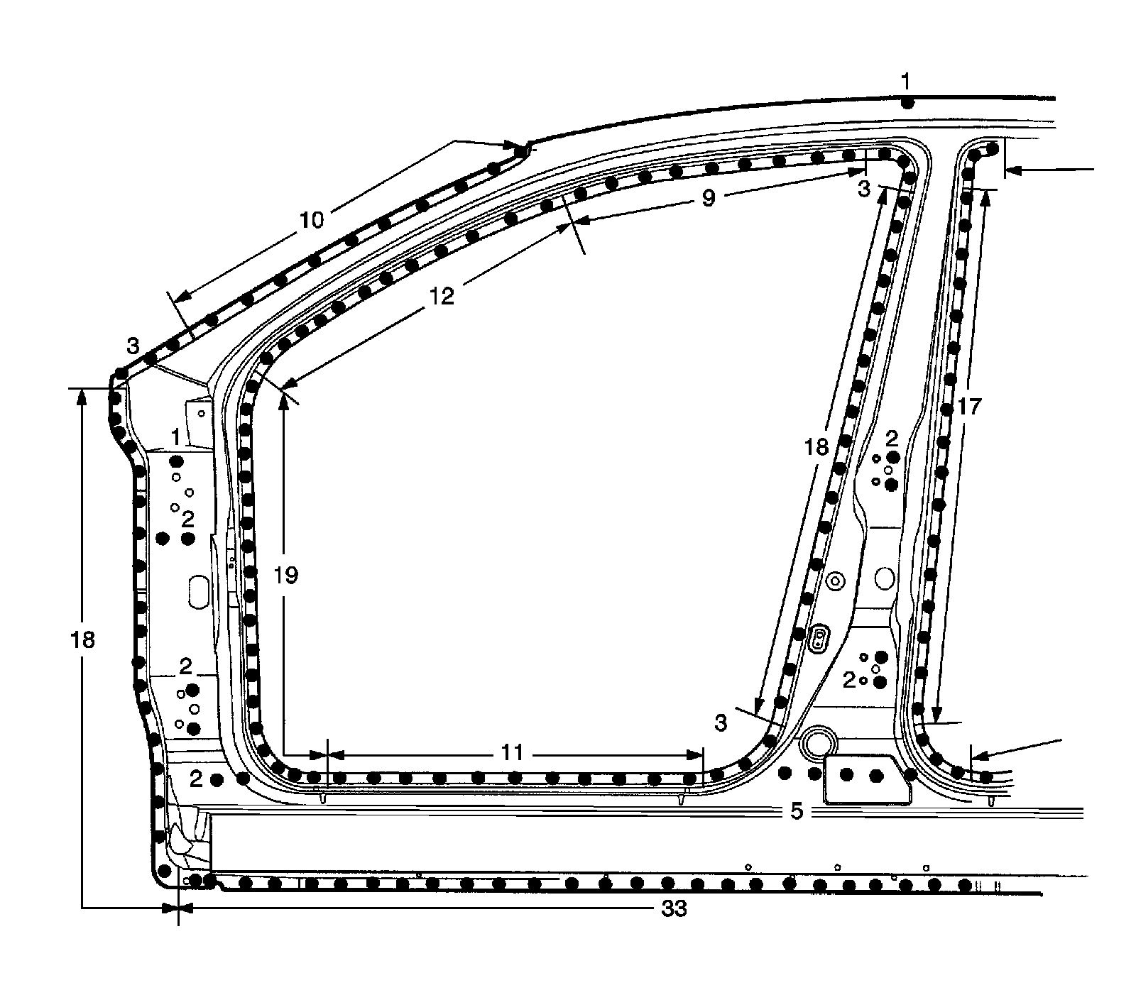 The frame door openings consist of frame door area and side outer area. It forms the base for the front, rear doors and other parts and maintains the rigidity of the doors and roof. The frame door opening area should, depending on the degree of damage, be repaired as much as possible rather than replaced. (Repair by pulling out)