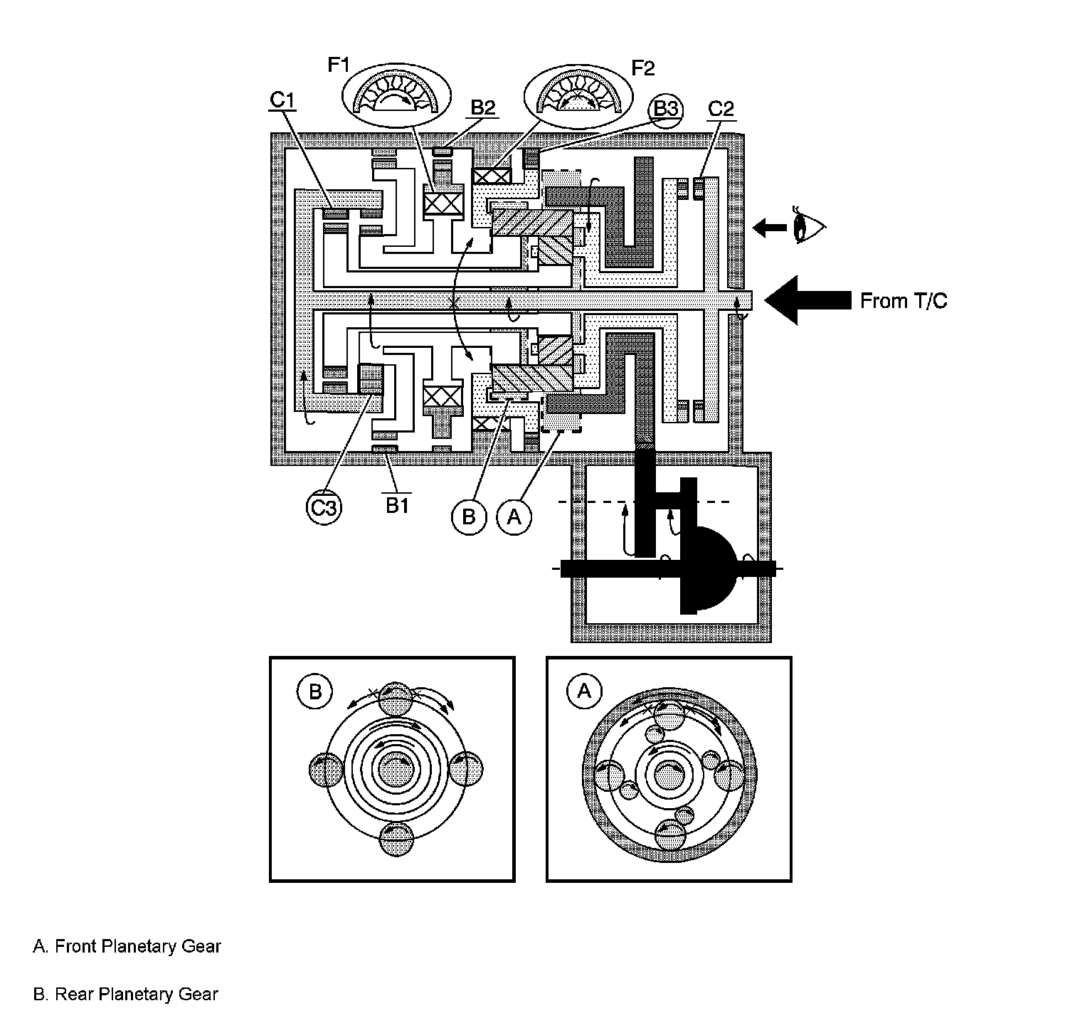 1. The input shaft rotates clockwise.The reverse clutch (C3) operates. Connect the input shaft to the rear planetary sun gear.