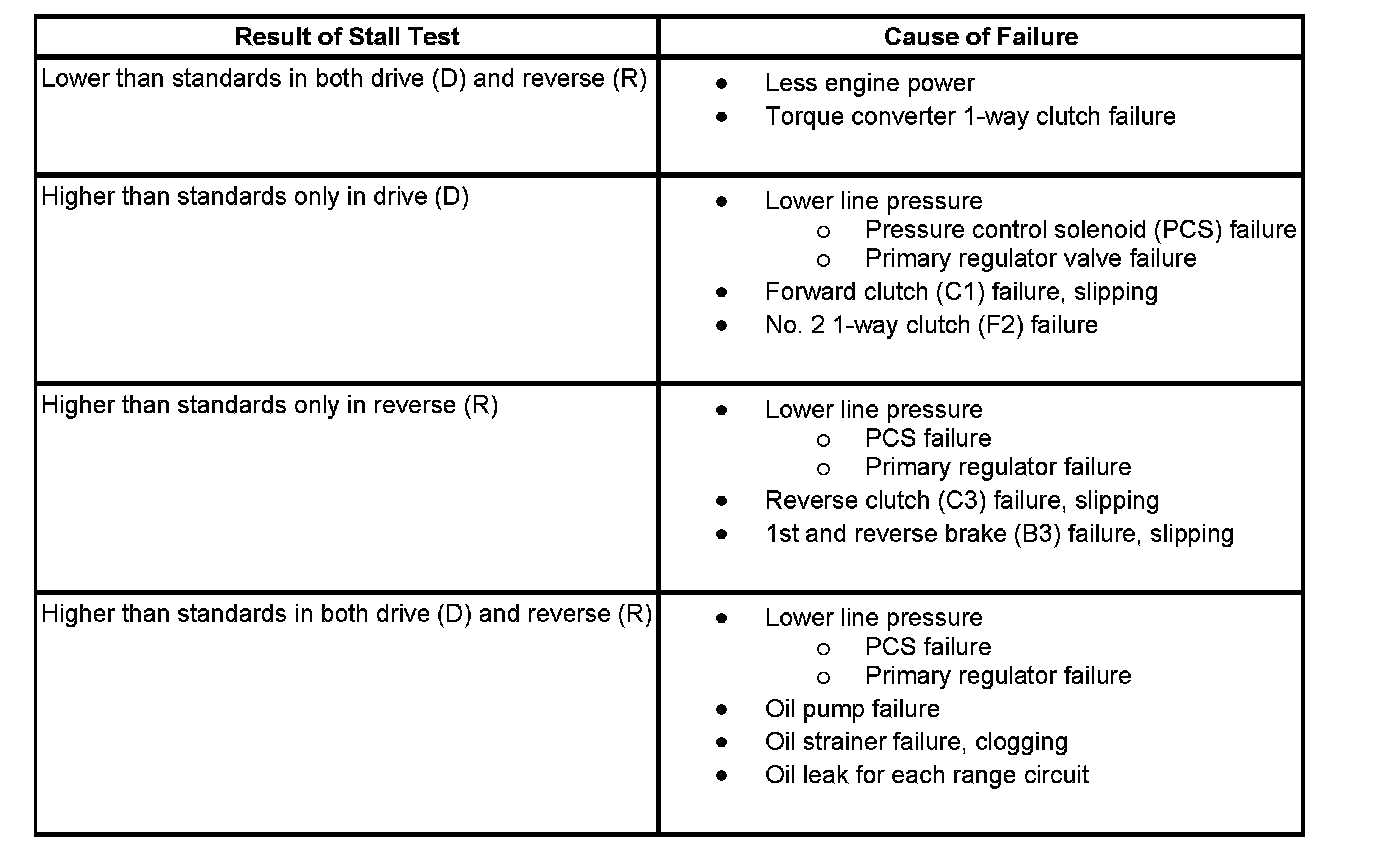 Functional Test ProcedureThe purpose of the stall test is to inspect overall performance of the A/T and the engine by measuring the stall speed in drive (D) and reverse (R) range.
