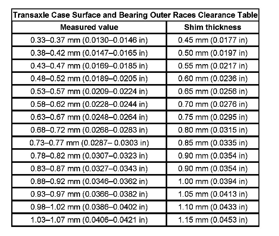 Transaxle Case Surface and Bearing Outer Races Clearance Table: