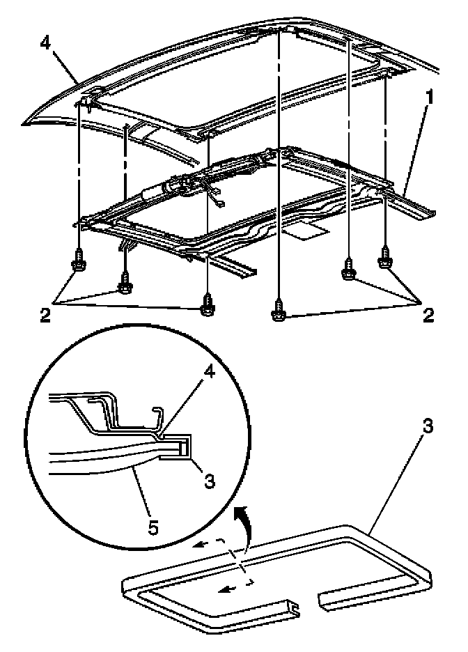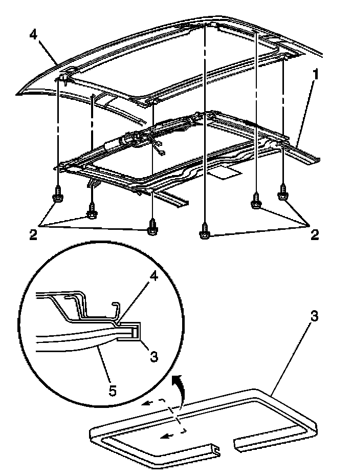 5. With an assistant, remove the sunroof module assembly (1), by pulling the module downward at the rear mounting points to disengage the white locating pins.