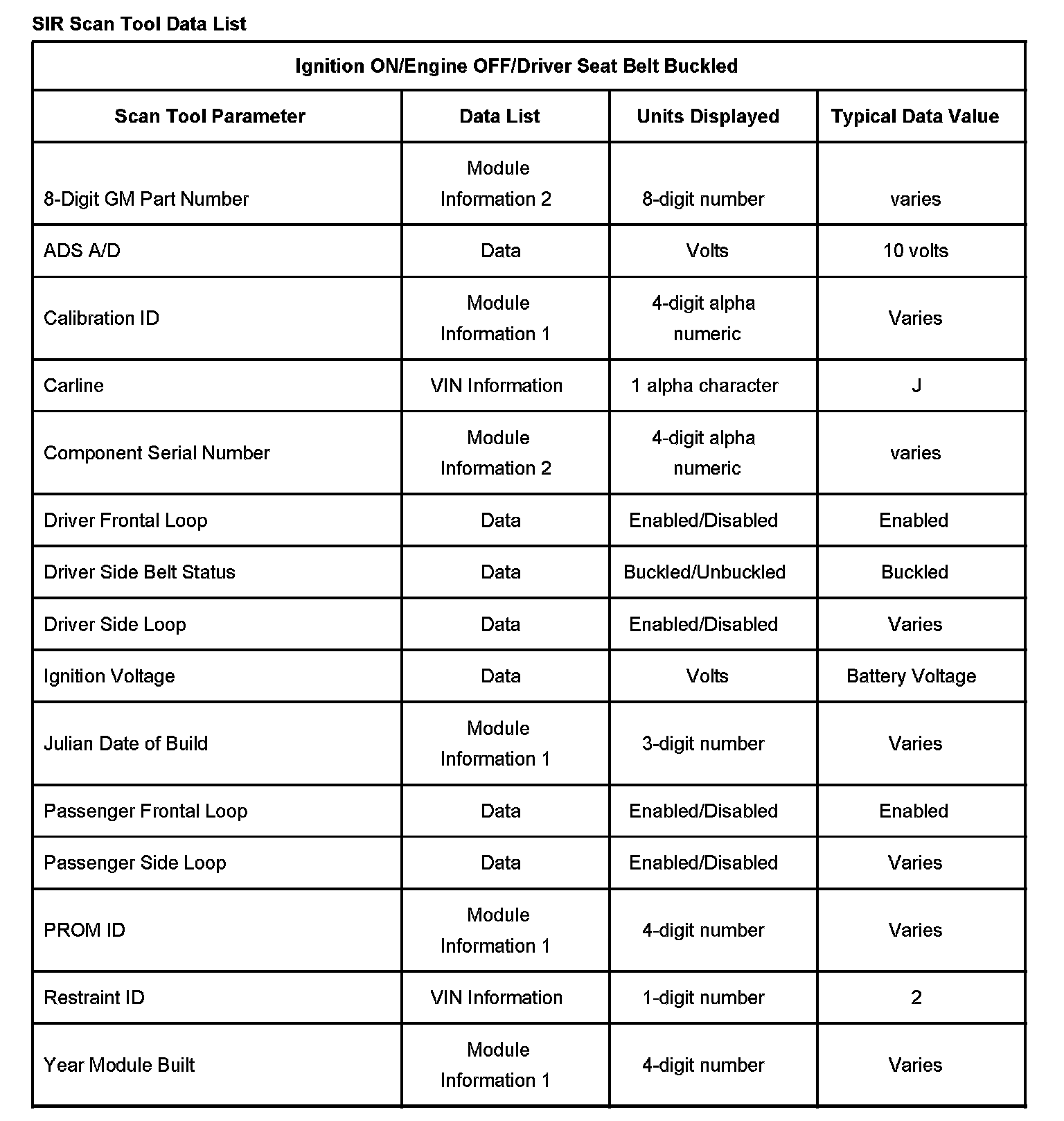 The SIR Scan Tool Data List contains all the restraint system related parameters that are available on the scan tool. The parameters in the list are arranged in alphabetical order. The column, "Data List," indicates the location of the parameter within the scan tool menu selections.