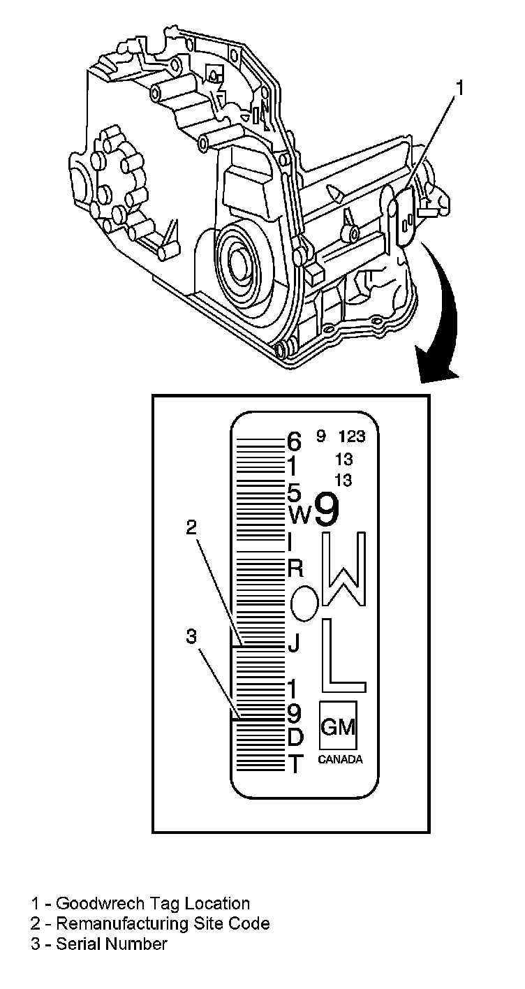The Vehicle Identification Number (VIN) Derivative location for the 4T40-E Transmission (1).
