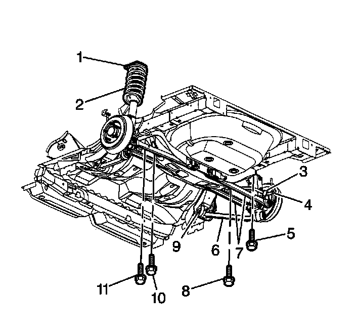 Remove the rear suspension mounting bolts (5, 8, 10, 11).