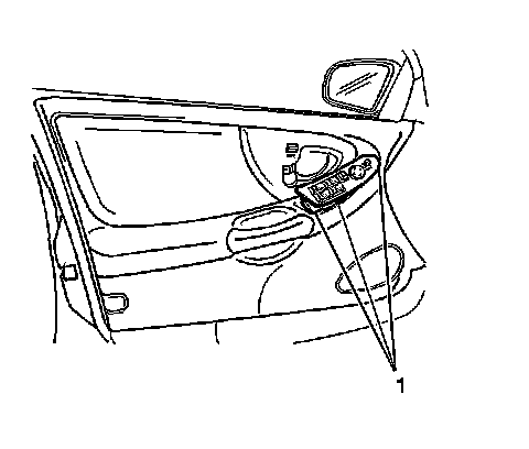 1. With a flat-bladed tool release the power accessory switch panel retainers (1). Push in and lift up on the retainers to remove the switch plate (1) from the door trim panel.
