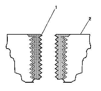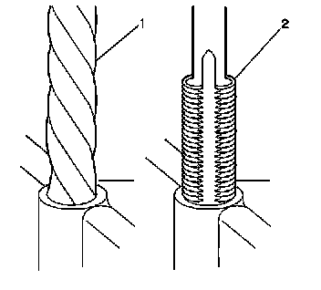 13. Inspect the insert for proper installation into the hole.A properly installed insert (1) will be either flush or slightly below flush with the surface of the base material (2).