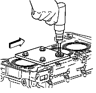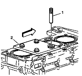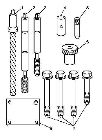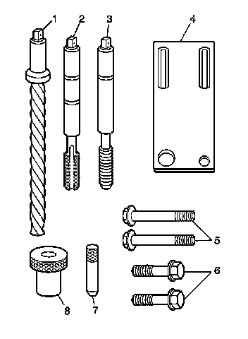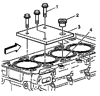 Install the fixture plate (3), bolts (1), and bushing (2) onto the engine block deck.Position the fixture plate and bushing over the hole that is to be repaired (4).