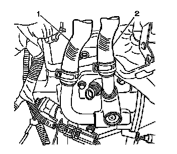 13. Remove the inlet heater hose (1) and outlet heater hose (2).