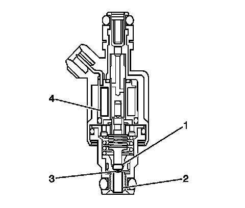 The fuel injector assembly is a solenoid device controlled by the control module that meters pressurized fuel to a single engine cylinder. The control module energizes the high-impedance, 12 ohms, injector solenoid (4) to open a normally closed ball valve (1). This allows fuel to flow into the top of the injector, past the ball valve, and through a director plate (3) at the injector outlet. The director plate has machined holes that control the fuel flow, generating a spray of finely atomized fuel at the injector tip (2). Fuel from the injector tip is directed at the intake valve, causing the fuel to become further atomized and vaporized before entering the combustion chamber. This fine atomization improves fuel economy and emissions. The fuel pressure regulator compensates for engine load by increasing fuel pressure as the engine vacuum drops.