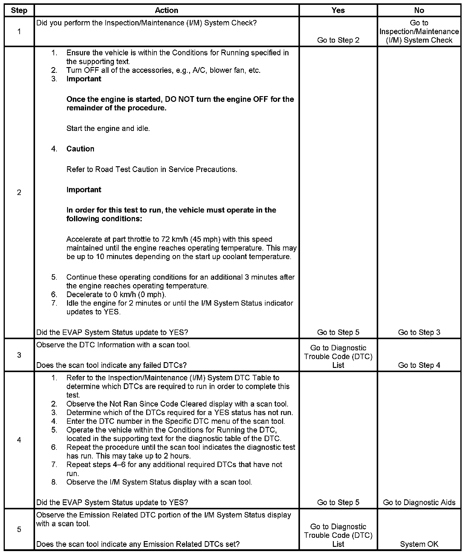 The purpose of this test is to satisfy the enable criteria necessary to execute I/M readiness diagnostics for the evaporative emission (EVAP) system. The test may be used to set the I/M System Status indicators to YES. The I/M System Status Display on the scan tool provides an indication of whether the control module has completed the required tests. The I/M System Status does not indicate that the tests have passed or failed. When all of the diagnostics for a specific system have run and passed the I/M System Status will update to YES. If a test for a specific system has failed, the I/M System Status will update to YES, indicating a determination was made, even if all of the other tests for that system have not run. Performing a visual inspection prior to running the EVAP test may prevent having to repeat the test. A failed or aborted test will require the vehicle to cool down in order to meet the enable criteria to run another test.