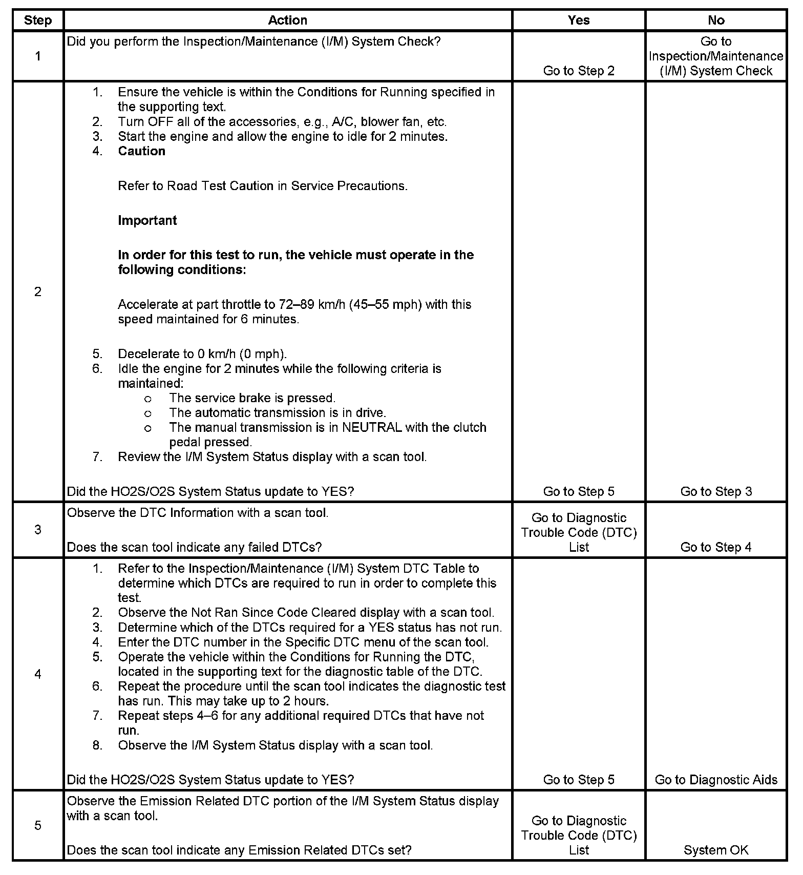The purpose of this test is to satisfy the enable criteria necessary to execute I/M readiness diagnostics for the oxygen sensor/heated oxygen sensor (O2S/HO2S) system. The test may be used to set the I/M System Status to YES. The I/M System Status Display on the scan tool provides an indication of whether the control module has completed the required tests. The I/M System Status does not indicate that the tests have passed or failed. When all of the diagnostics for a specific system have run and passed the I/M System Status will update to YES. If a test for a specific system has failed, the I/M System Status will update to YES, indicating a determination was made, even if all of the other tests for that system have not run.
