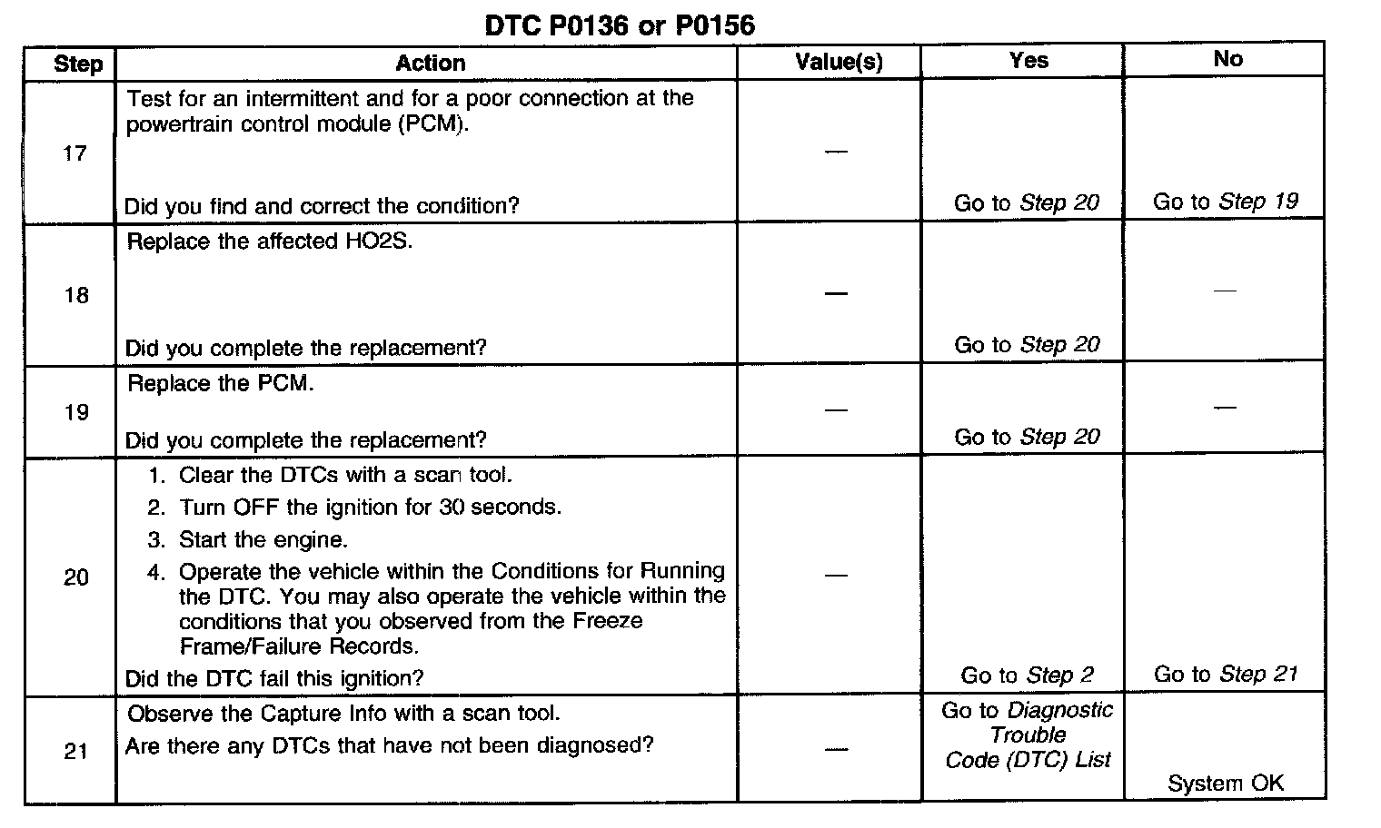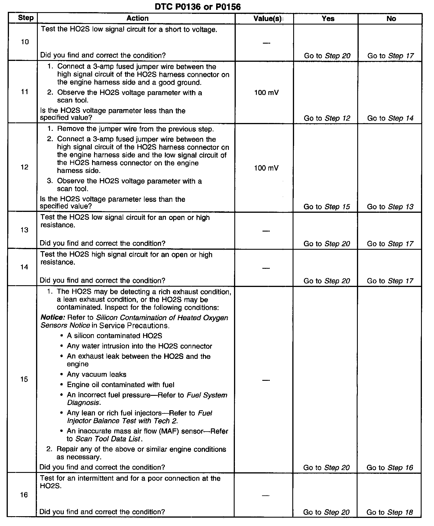 The HO2S bank 1 sensor 2 and HO2S bank 2 sensor 2 are used for catalyst monitoring. This diagnostic runs once per ignition cycle. This diagnostic consists of two tests, a passive test and an intrusive test. During the passive test, if the HO2S bank 1 sensor 2 or HO2S bank 2 sensor 2 voltage transitions below 350 mV and above 709 mV, the DTC will pass for this ignition cycle. If the DTC does not pass during the passive test, the intrusive test will begin. During the intrusive test, the control module will force the air-to-fuel ratio rich and/or lean. The control module then waits for a predicted response from the HO2S. If the HO2S voltage transitions below 350 mV and/or above 709 mV, the DTC will pass for this ignition cycle. If the control module does not receive the expected response from the HO2S, DTC P0136 will set for HO2S bank 1 sensor 2 or DTC P0156 will set for HO2S bank 2 sensor 2.