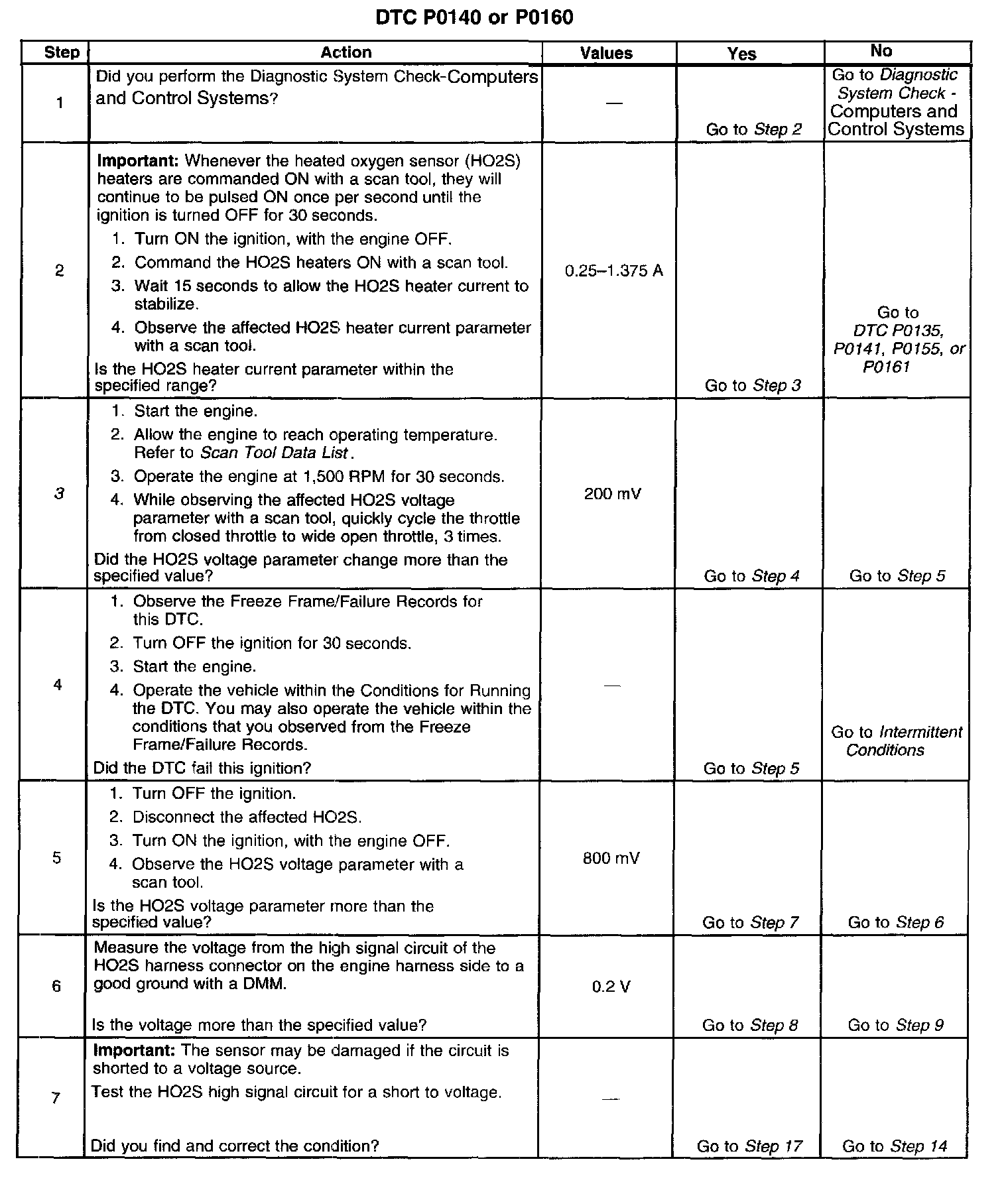 Heated oxygen sensors (HO2S) are used for fuel control and post catalyst monitoring. Each HO2S compares the oxygen content of the surrounding air with the oxygen content in the exhaust stream. The HO2S must reach operating temperature to provide an accurate voltage signal. Heating elements inside the HO2S minimize the time required for the sensors to reach operating temperature. The powertrain control module (PCM) supplies the HO2S with a reference, or bias, voltage of about 450 mV. When the engine is first started the PCM operates in open loop, ignoring the HO2S voltage signal. Once the HO2S reaches operating temperature and closed loop is achieved, the HO2S generates a voltage within a range of 0-1,000 mV that fluctuates above and below bias voltage. High HO2S voltage indicates a rich exhaust stream; low HO2S voltage indicates a lean exhaust stream. This diagnostic will only run once per ignition cycle. If the PCM detects that the HO2S voltage remains within the bias voltage range, DTC P0140 sets for HO2S bank 1 sensor 2, or P0160 sets for HO2S bank 2 sensor 2.