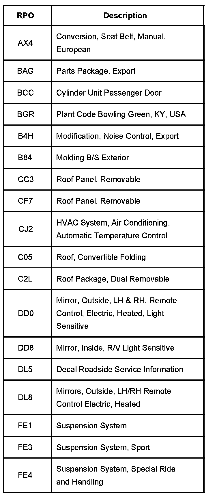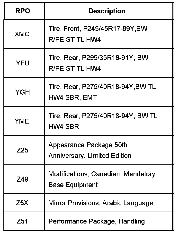 The production/process codes provide the description of the Regular Production Options (RPOs) used on the Corvette. The RPO list is printed on the Service Parts Identification Label.