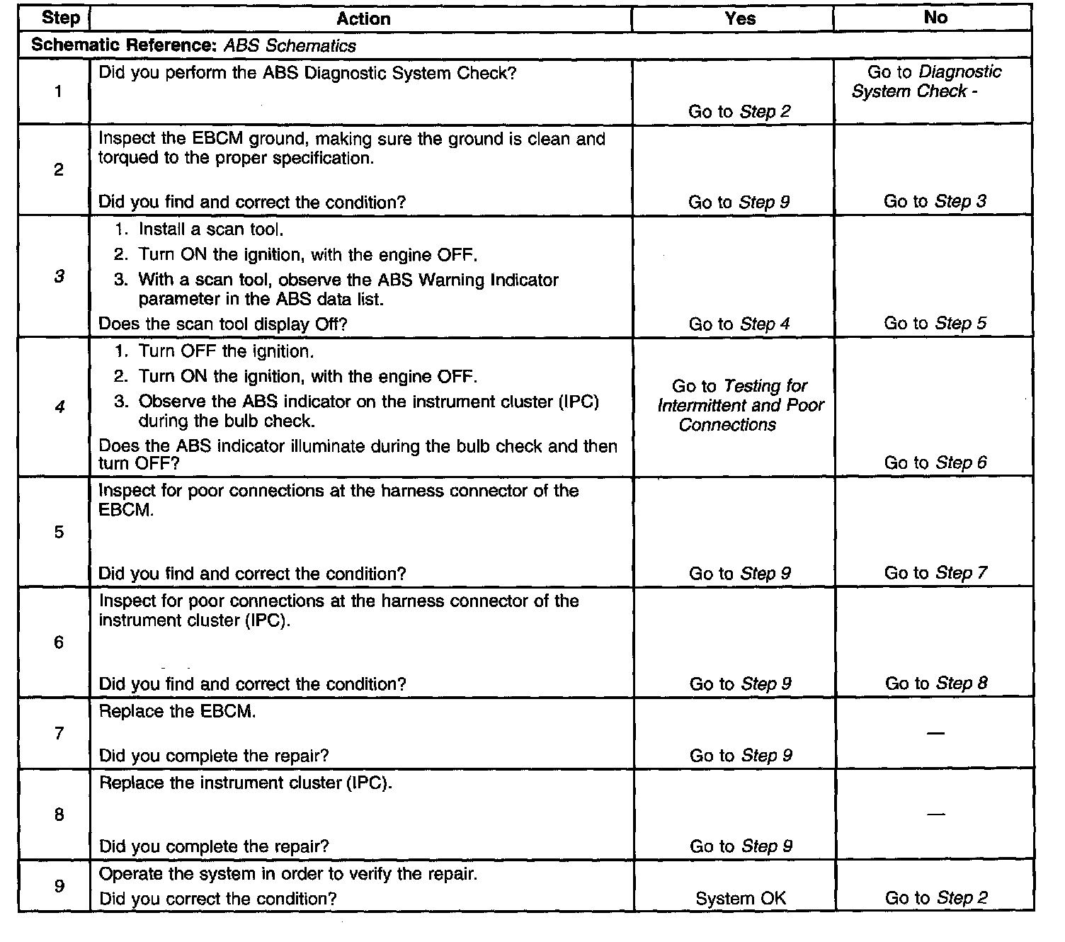 The instrument cluster controls the operation of the ABS indicator. The EBCM reports the desired status of the ABS indicator via serial data messages.