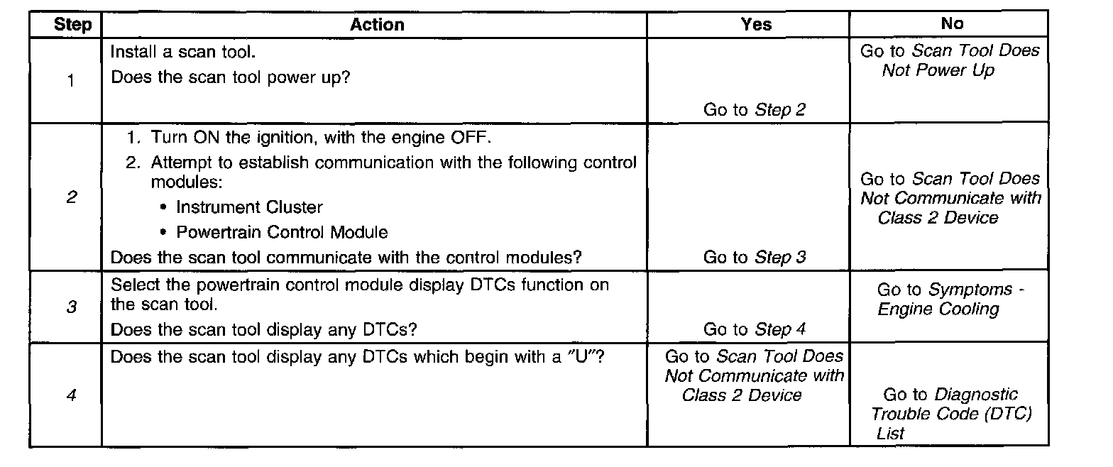 2. Lack of communication may be due to a partial malfunction of the class 2 serial data circuit or due to a total malfunction of the class 2 serial data circuit. The specified procedure will determine the particular condition.