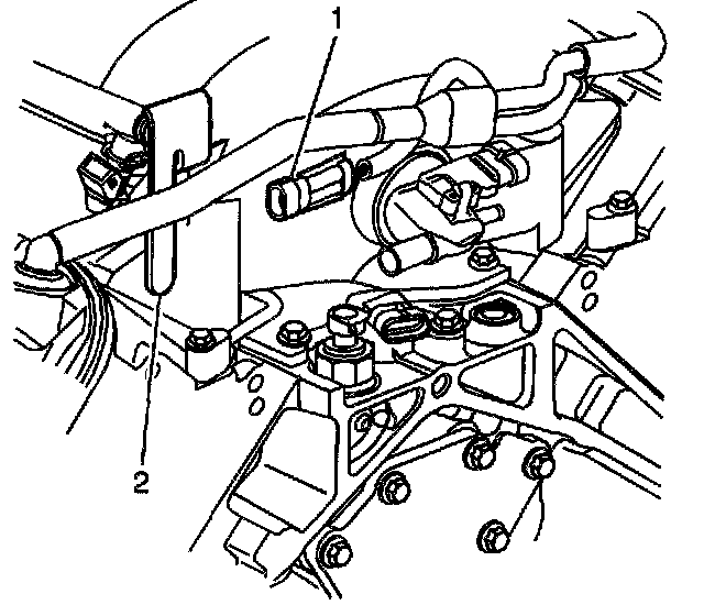 17. Install the knock sensor wire harness (1) to the fuel rail stop bracket (2).