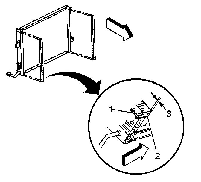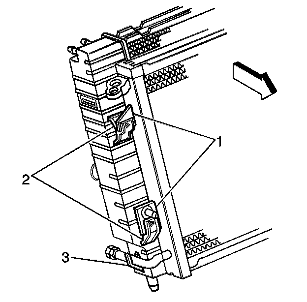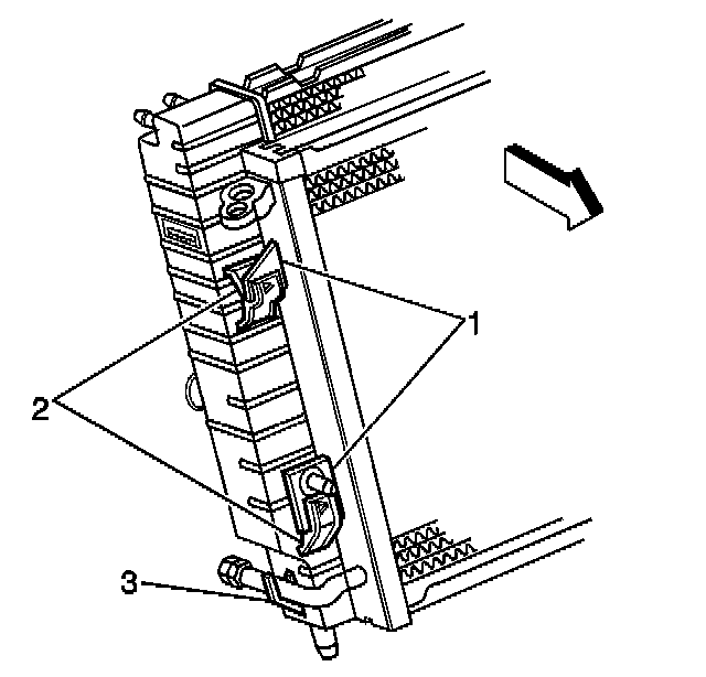 15. Raise the condenser along the radiator to release the condenser tabs (1) from the radiator slots (2).