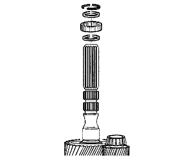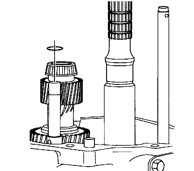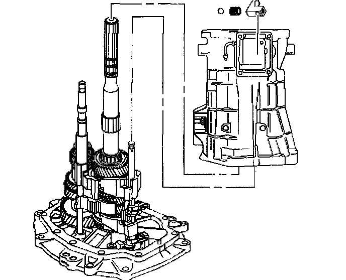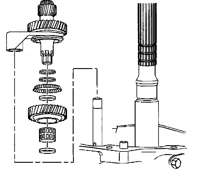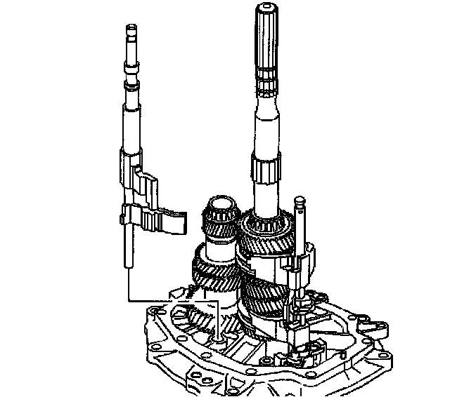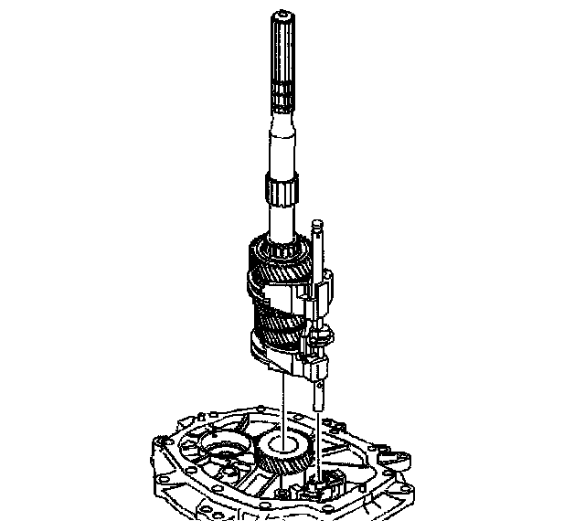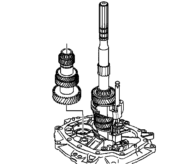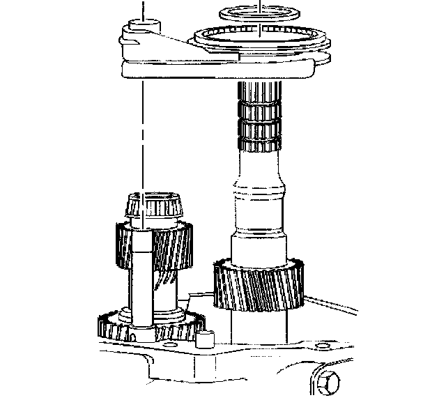 3. Remove the countershaft extension assembly with the 5th/6th speed shift fork, 6th speed gear bearing spacer, 6th speed drive gear, and caged needle bearing. The 6th speed gear bearing spacer will slide out during removal of the countershaft extension assembly.