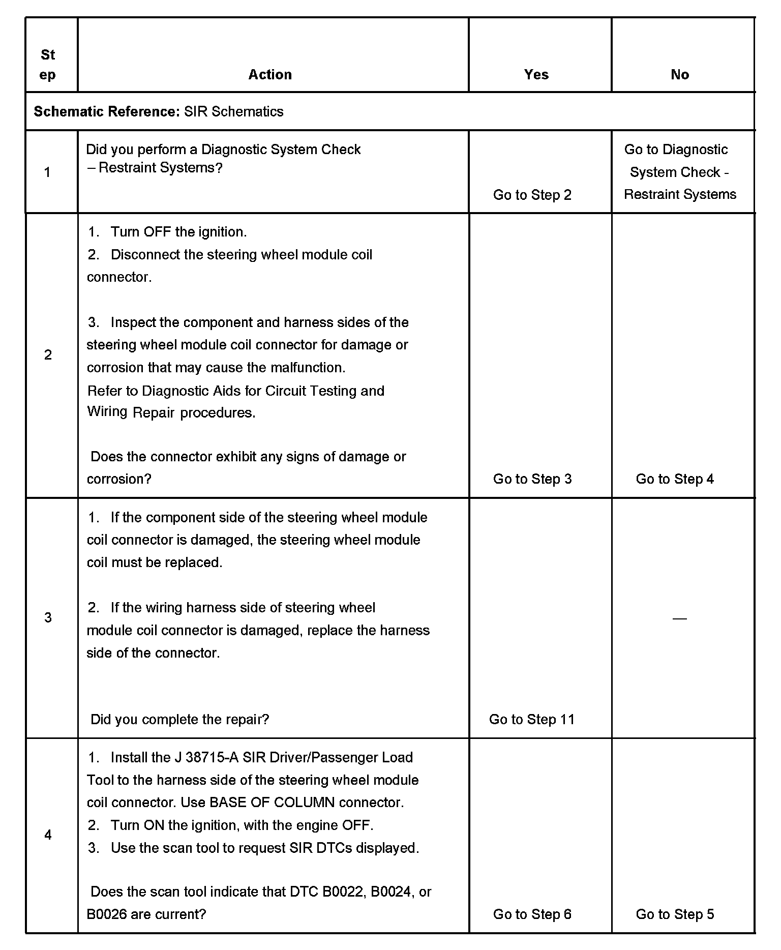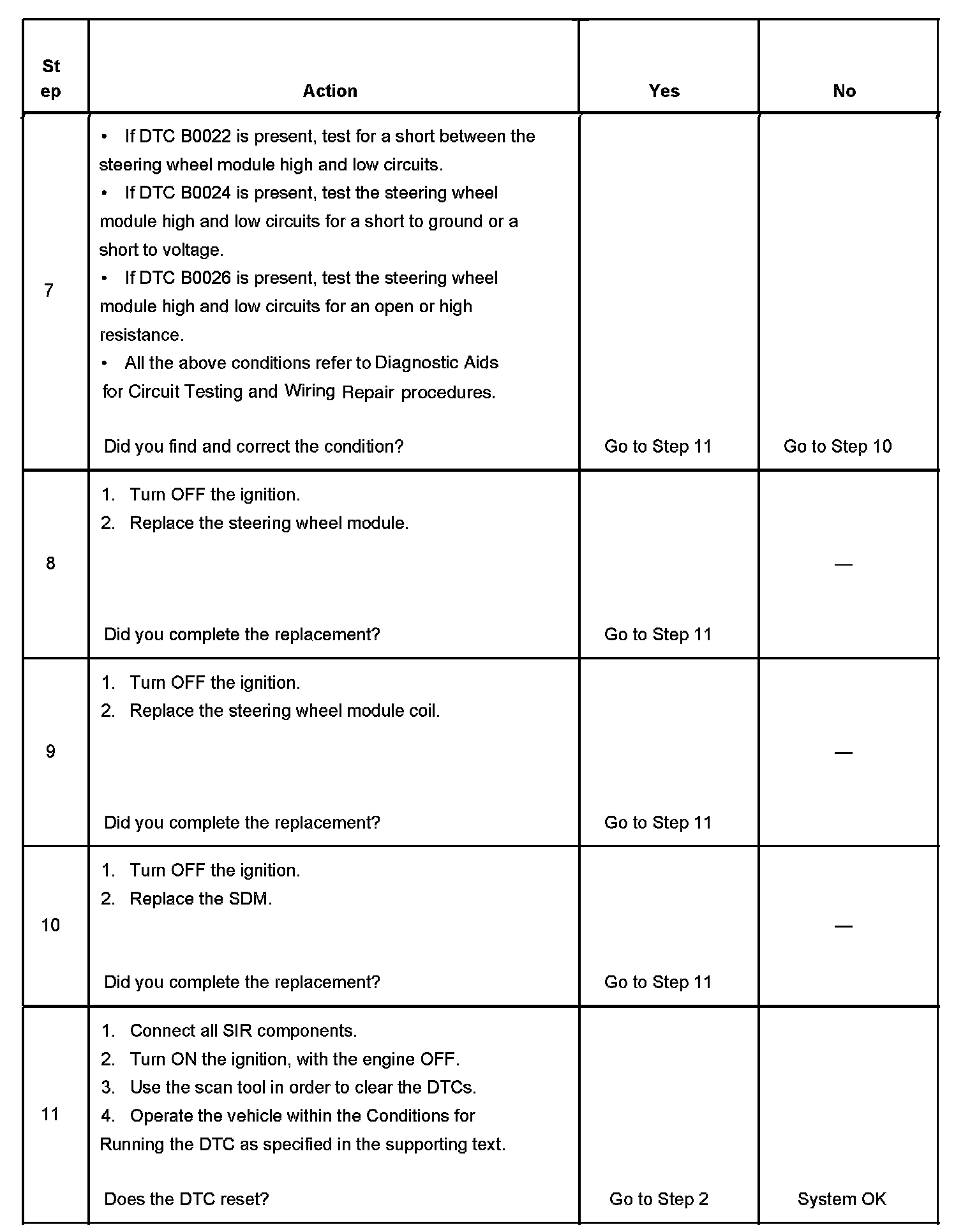 7. This step tests to see what DTCs are present. If DTC B0022 is present, test for a short between the steering wheel module high and low circuits. If DTC B0024 is present, test the steering wheel module high and low circuits for an open and for high resistance. If DTC B0026 is present, test the steering wheel module high and low circuits for an open and for high resistance.
